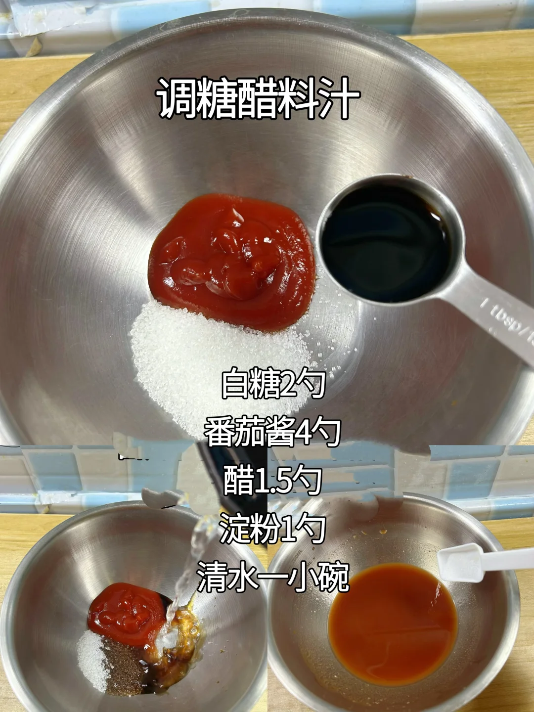 3.调糖醋汁:白糖2勺,番茄酱4勺,醋1.5勺,淀粉1勺,清水一小碗,搅拌均匀。