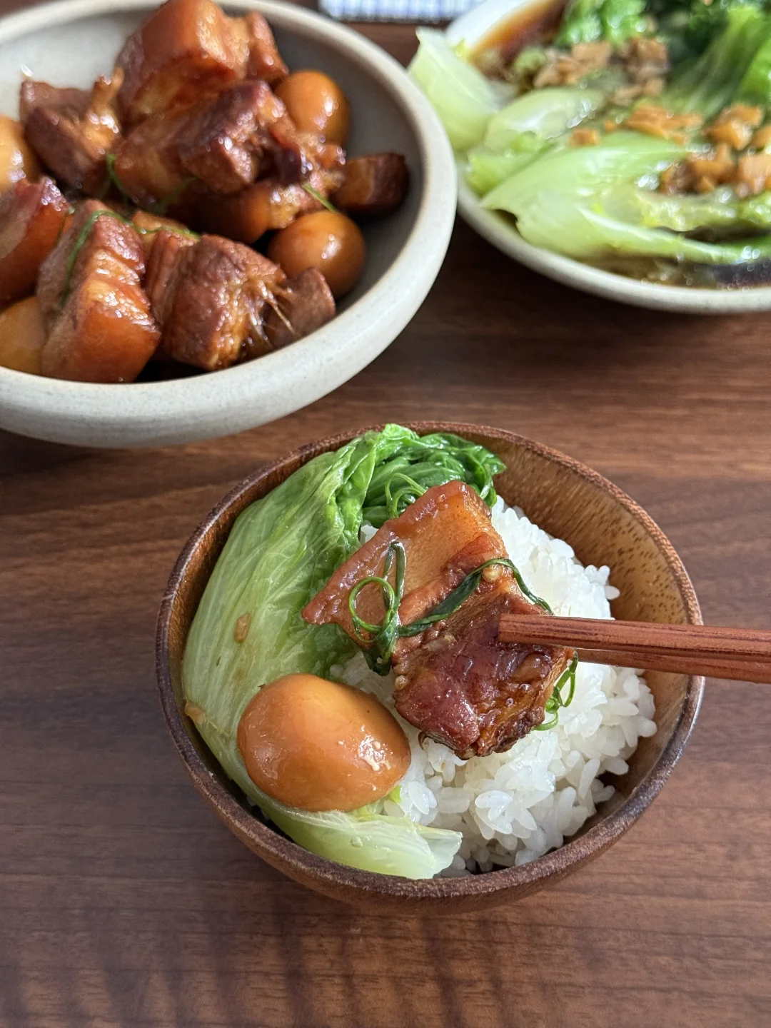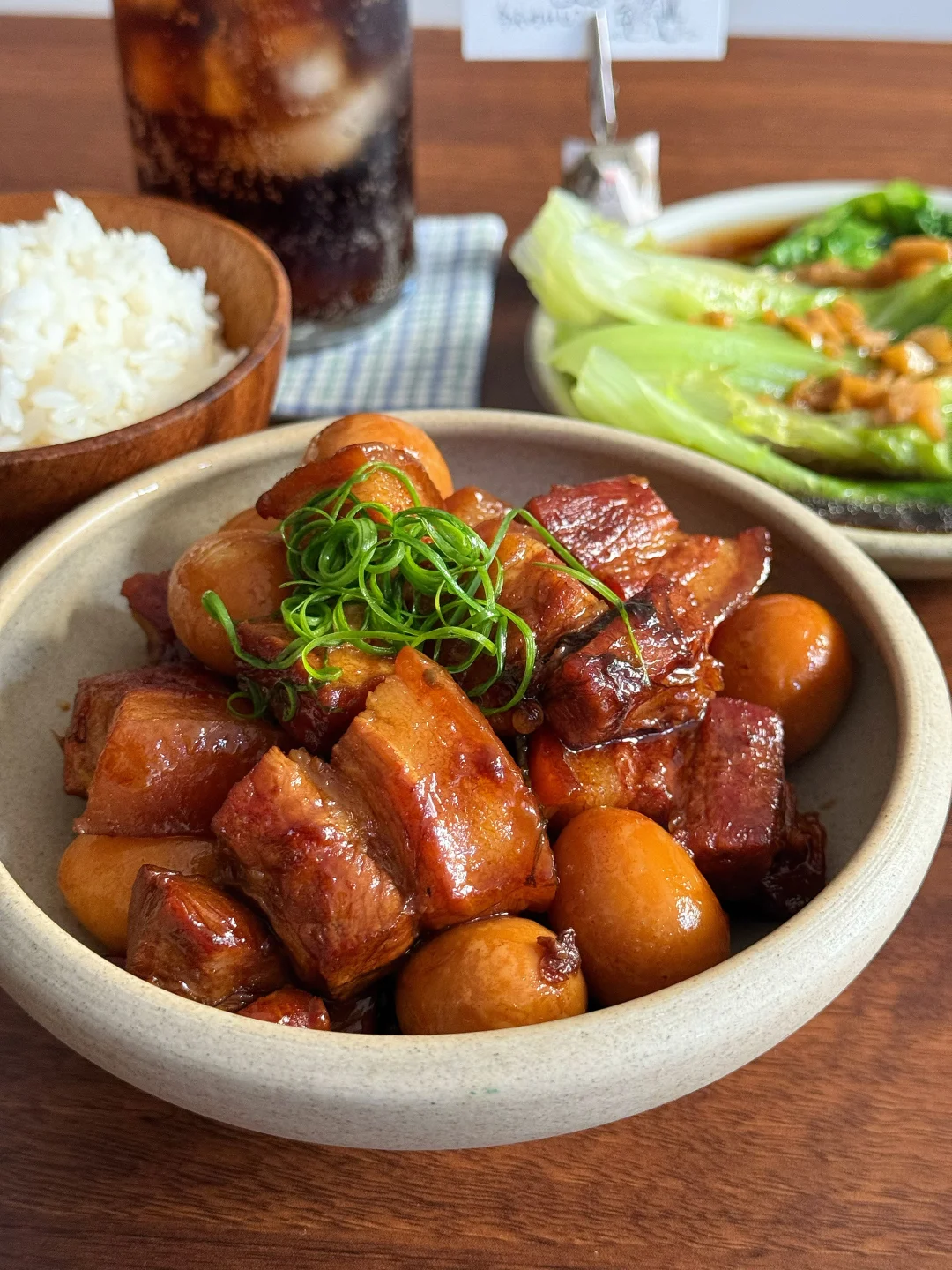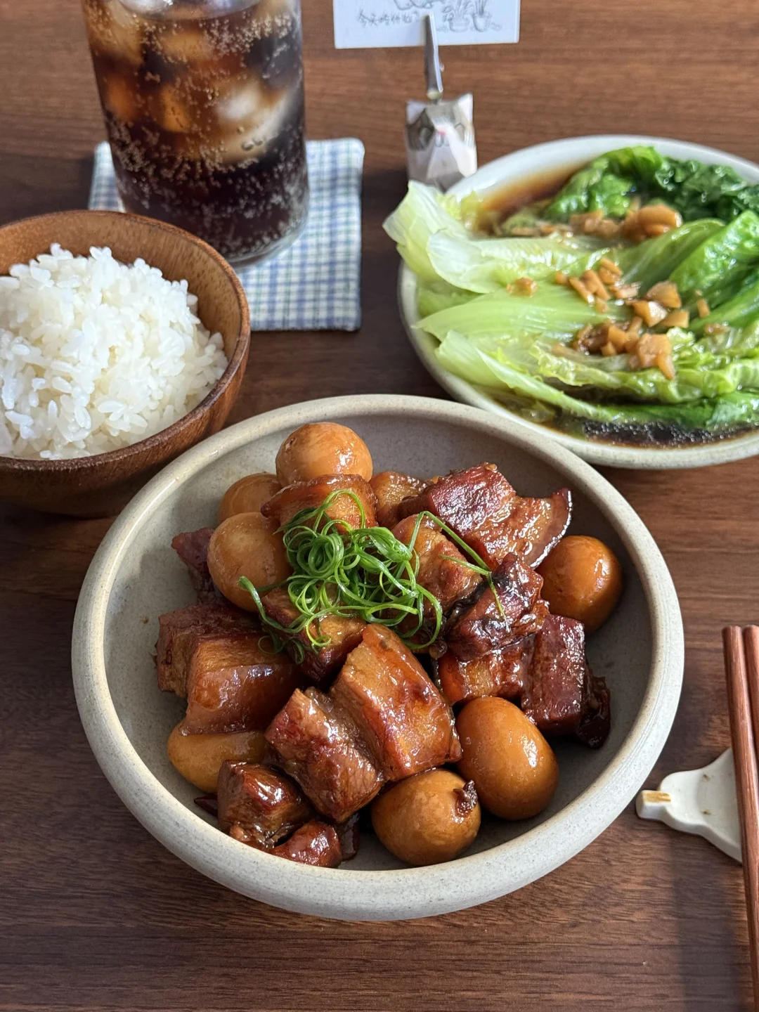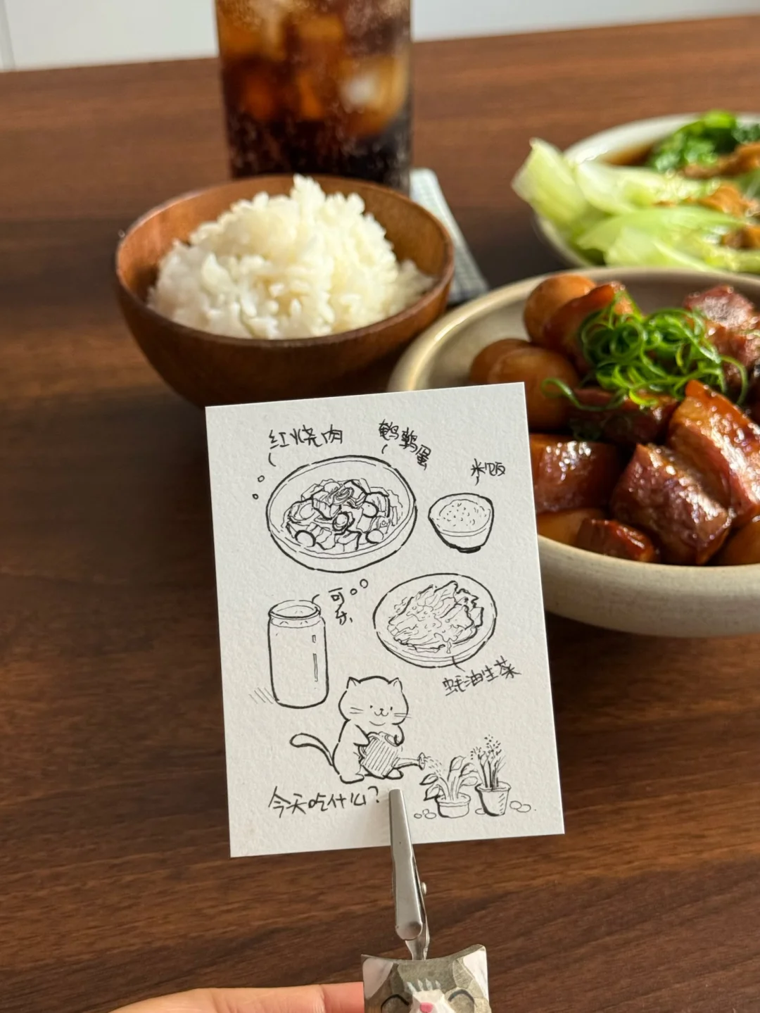 今日美食:鹌鹑蛋红烧肉,蚝油生菜,米饭,可乐 在室外天冷的很,揣着冻僵的手冲回家,哐哐做美食,端出这桌直接原地复活😭! 红烧肉炖到软烂,色泽诱惑十足,鹌鹑蛋也裹满了肉汁,咬开的瞬间太满足了!就着热米饭,我直接干翻两碗!年夜饭我也要安排这道菜! 蚝油生菜就是灵魂解腻选手,脆嫩嫩的裹着咸鲜酱汁,一口肉一口菜,我的幸福真的太简单啦! 扒完饭才惊觉,马年新春都要冲线了!这种暖到心窝子的小日子,才是人间值得啊✨