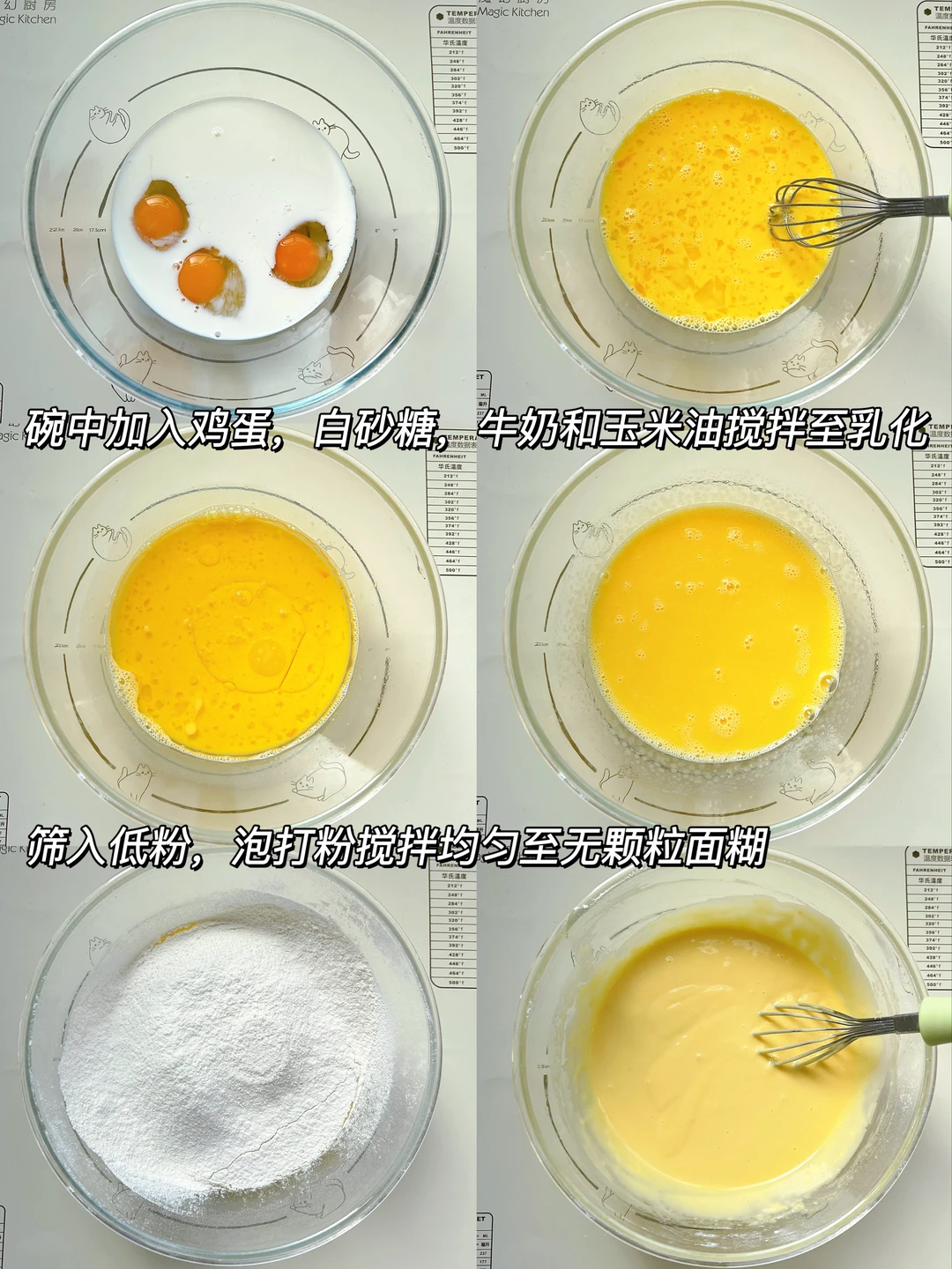1⃣准备好食材.碗中倒入鸡蛋➕白砂糖➕牛奶➕玉米油充分搅拌均匀