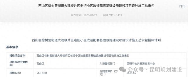 1月19日,云南省公共资源交易信息网发布《西山区棕树营街道大观楼片区老旧小区改造配套基础设施建设项目设计施工总承包》招标计划。