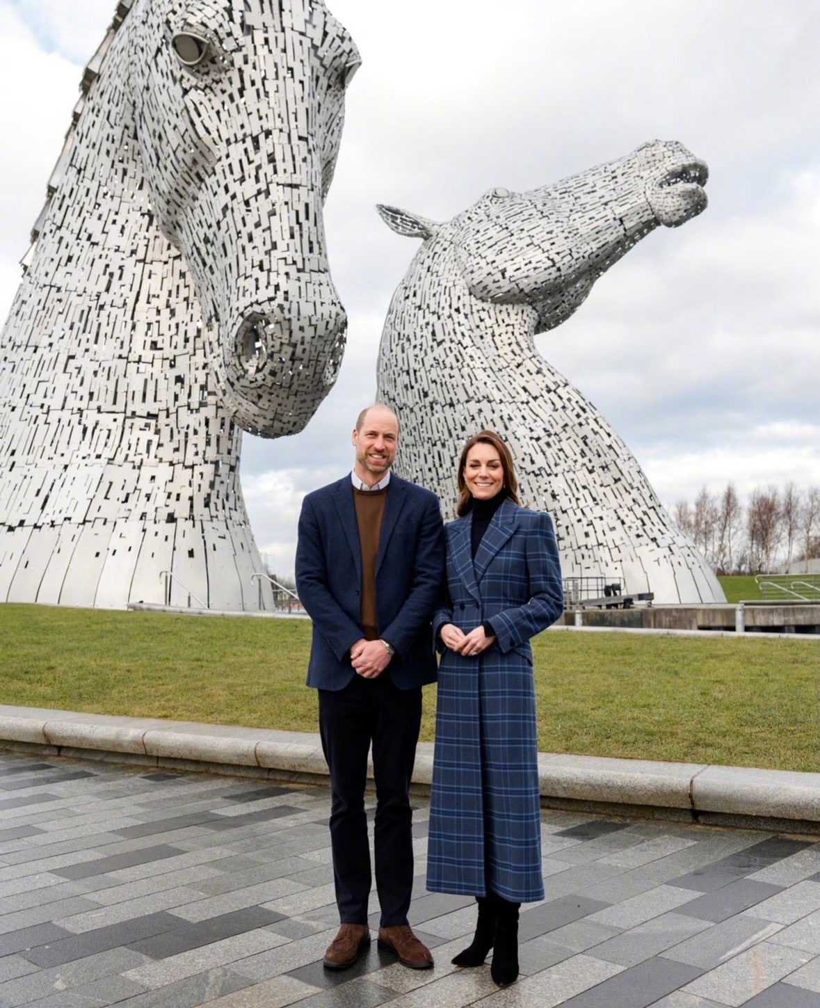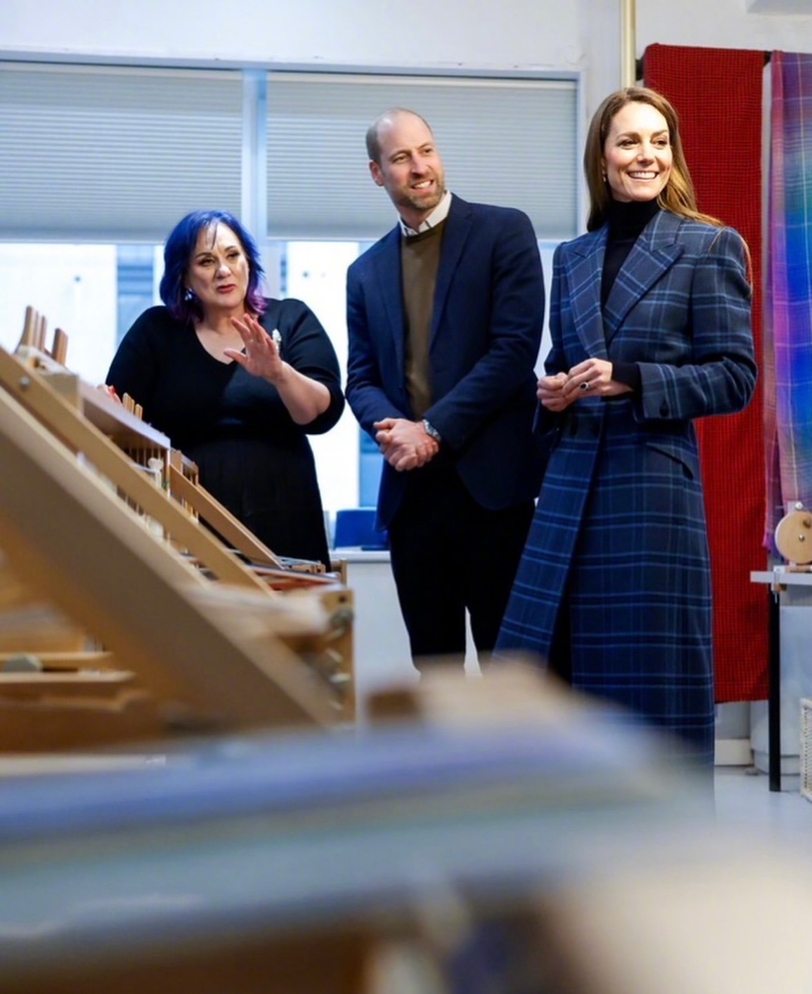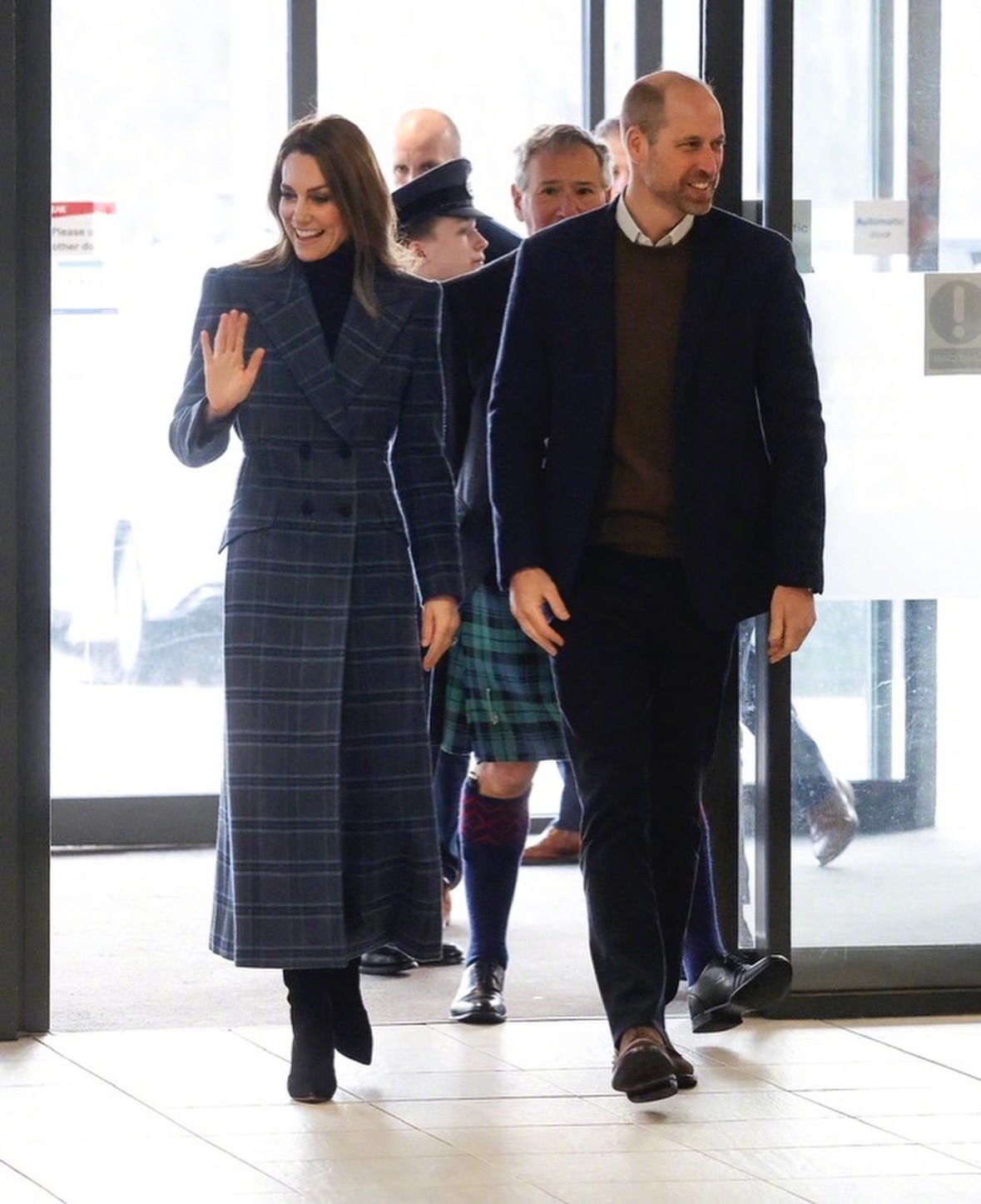 当地时间1月20日,威廉王子和凯特王妃访问斯特林(Stirling)和福尔柯克(Falkirk),此次访问是突出呈现独特的苏格兰文化传统。在苏格兰期间,他们被称为罗斯西公爵和公爵夫人(The Duke and Duchess of Rothesay)。当天的首站,会见了英国队及残奥会冰壶队,他们正在为即将在米兰-科尔蒂纳举行的冬奥会做准备。随后又参观了 Radical Weavers——位于斯特林市中心的手工织布工作室及独立慈善机构,并亲手尝试制作苏格兰格子呢(Tartan)🪡。在最后一项行程中,俩人访问了 “The Goth”。这家酒吧成立于1910年,是苏格兰少数仍按照哥德堡系统运营的酒吧之一,酒吧及饮品收入的一部分会返还社区。凯特身穿Chris kerr定制蓝色格子呢大衣,内穿zara 海军蓝纽扣袖高领毛衣,脚穿Gianvito rossi 海军蓝绒面 Rhymes 靴,佩戴椭圆形蓝宝石吊坠耳环。米拉服饰解析