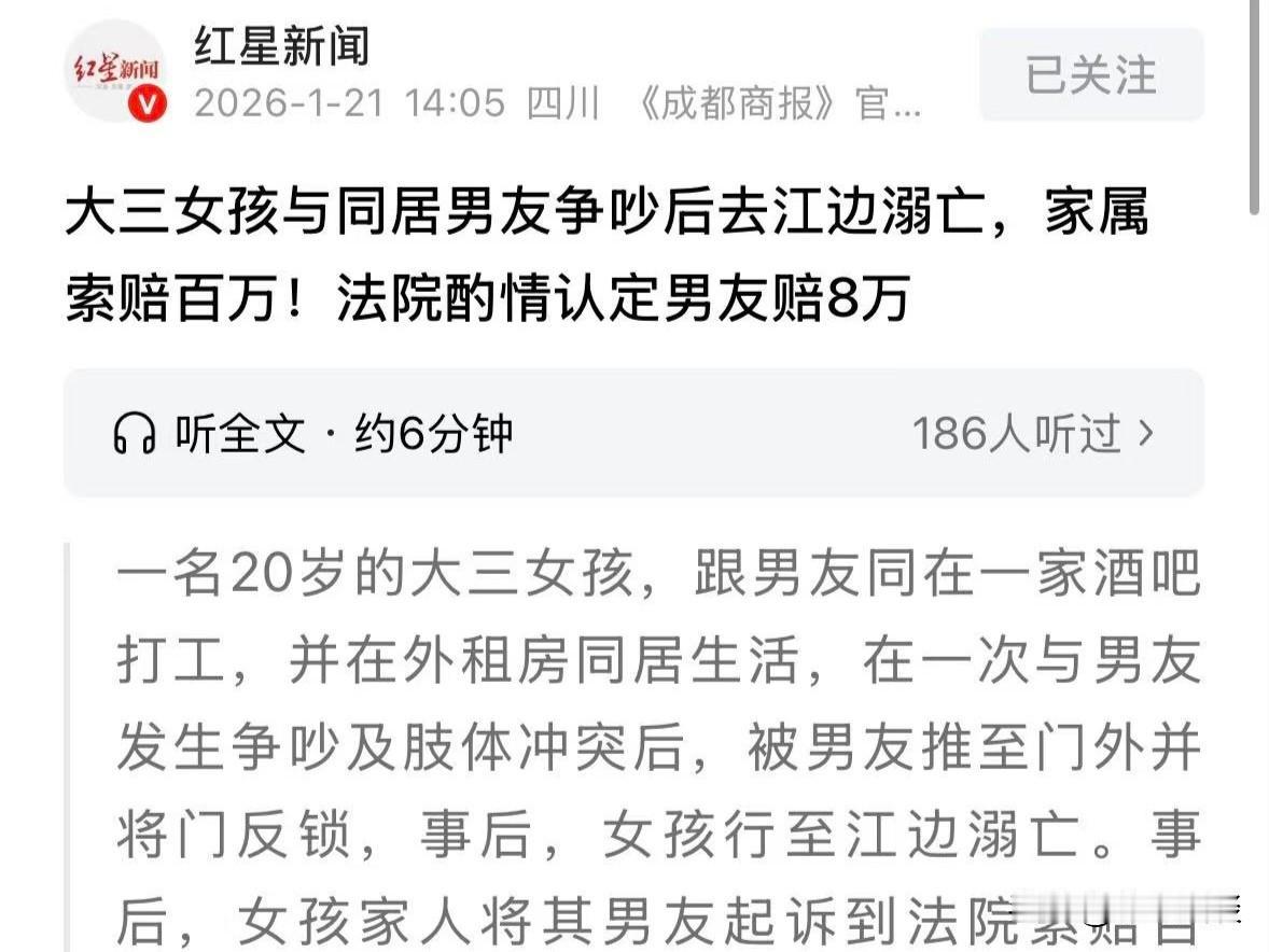 湖北武汉,女大学生在酒吧玩了一宿,第二天早上回到住处后,与男友发生争吵,二人在拉扯过程中不小心把穿衣镜带倒,碎片把女子划伤,之后被男友推出门外并反锁,女子一气之下跑到江边。几个小时后,男友及朋友一起去寻找女子,结果竟被告知女子已经溺亡,事后,女子父母将男友告上法庭,要求赔偿104万,没想到一审二审最后这样判了! 小苏今年20岁,是一名大三学生,按说这个年纪,应该是专心读书的阶段。 但小苏却和男友王某一起在酒吧找了份工作,还租了个房子过起了小日子。 2024年4月1日晚上,小苏一整晚都泡在酒吧里,又是喝酒又是唱歌,闹腾了整整一夜没合眼。 直到第二天早上8点多,天早就大亮了,她才醉醺醺地从酒吧回到家。 可谁能想到,回家等待她的不是热饭热菜,而是一场大争吵。 原来在小苏在酒吧的这一整夜,她和王某之间不知道因为啥闹了矛盾,王某已经把小苏的微信给删了。 小苏本来就喝了一宿的酒,情绪不稳定,到家又看男友鼻子不是鼻子脸不是脸的,气更是不打一出来。 火蹭一下就上来了,俩人越吵越激动,把家里的桌子给掀了。 桌子上的东西摔得满地都是,碗碟碎了一地。 两个人你一言我一语地吵得面红耳赤,说着说着就动起手来拉扯彼此。 在两人的拉扯中,不小心把旁边立着的全身镜被两人不小心带倒了。 镜子的碎片瞬间溅得到处都是,小苏躲闪不及,身上被锋利的碎片划了好几道口子。 可这时候两人都在气头上,谁也没顾得上小苏的伤口。 王某被小苏掀桌子、动手拉扯的行为彻底惹毛了,直接把小苏推到门外,并把门反锁。 苏某被关在门外,又疼又气又委屈,站在门口不知道该怎么办。 这时候俩人共同的朋友杨某刚好在,看着小苏身上的伤口,就赶紧找了东西帮她清理伤口。 过了几分钟,小苏的情绪还是低落,憋了一肚子的气没地方撒,转头就下楼了。 王某见小苏出了门,也没有出去追她,反而和留下来的杨某一起在家喝起了酒。 两人一边喝一边还聊这事,王某边喝边抱怨苏某脾气差、不懂事。 但过了气头,他还是惦记女友,因为两个人手机都互相有定位,便拿出手机看小苏的位置。 定位显示小苏一直在长江边,一直没有移动。 好友杨某便提议去看看,一个人在那带那么久别出啥事。 王某看了眼位置无所畏道:没事,她以前心情不好的时候也总去江边散心。 每次都得自己待够了才肯回来,到时候自然会给我打电话让我去接她的。 就这么着,王某凭着以往的经验,打消了杨某要去找小苏的念头。 两人继续在家喝酒,把江边的小苏抛在了脑后。 一晃两个多小时过去了,11点多的时候,王某和杨某酒也喝得差不多了,发现小苏的定位还是没动。 王某沉不住气便和杨某一起去江边寻找小苏。 可他们到了江边,找了半天也没看到小苏的人影。 就在两人四处张望找人的时候,王某接到了帽子叔叔的电话。 帽子叔叔说发现其女友溺亡,要他赶紧过去辨认一下。 赶到现场后,王某整个人都傻了,那不是别人,正是女友小苏。 好好的一个人,怎么说没就没了。 后来经过调查,初步分析小苏是生前溺水死亡。 小苏的父母得知消息后,悲痛欲绝,他们觉得是王某害死了女儿,把他告上法院,要求赔偿104万余元。 小苏家属表示,王某长期冷暴力、贬低打压自己的女儿,还和其他女人搞暧昧,一步步把女儿逼得精神崩溃! 而且两人吵架后,把女儿赶出门外,发现他在江边1小时都不管。 就是他故意放任女儿寻短见,所以必须赔偿,还女儿一个公道。 《民典法》第1179条:侵害他人造成人身损害的,应当赔偿医疗费、护理费、交通费等为治疗和康复支出的合理费用,以及因误工减少的收入。 一审法院认定,小苏通宵饮酒后与王某争吵、肢体冲突,被王某反锁门外后赴江边溺水身亡。 虽溺水与王某无直接因果关系,但王某赶人行为是苏某离家的导火索。 可能间接促成损害后果,故判决王某赔偿小苏家属8万元。 对此王某很委屈,当天发生争吵也是因为女友在酒吧少喝酒所导致。 当天具体发生什么他也不知道,小苏是完全民事行为能力人,其出事是自主投江导致。 而她的父母也在本地,他们更有义务保护好自己的女儿。 而小苏的家属并不接受,他们称王某长期对女儿实施暴力、精神折磨,事发前曾表示要分手赶人。 王某明知小苏醉酒后在江边长时间未动,甚至定位显示其进入江中, 也未及时采取报警等有效措施,存在放任过错,认为小苏系自杀是由王某诱发。 二审法院觉得,小苏去世时都20岁了,是完全民事行为能力人,恋爱同居里的事该理智处理。 家属说王某长期暴力诱发苏某自杀,可没拿出足够证据,法院没采信。 因为小苏是和王某闹矛盾后自己去的江边,怎么溺水的没人知道,也没证据证明王某知道她想自杀。 最终二审驳回上诉,维持原判,判决王某赔偿小苏家属8万元。 对此,你怎么看? @静心法谈 学法辨是非,慬法不吃亏。