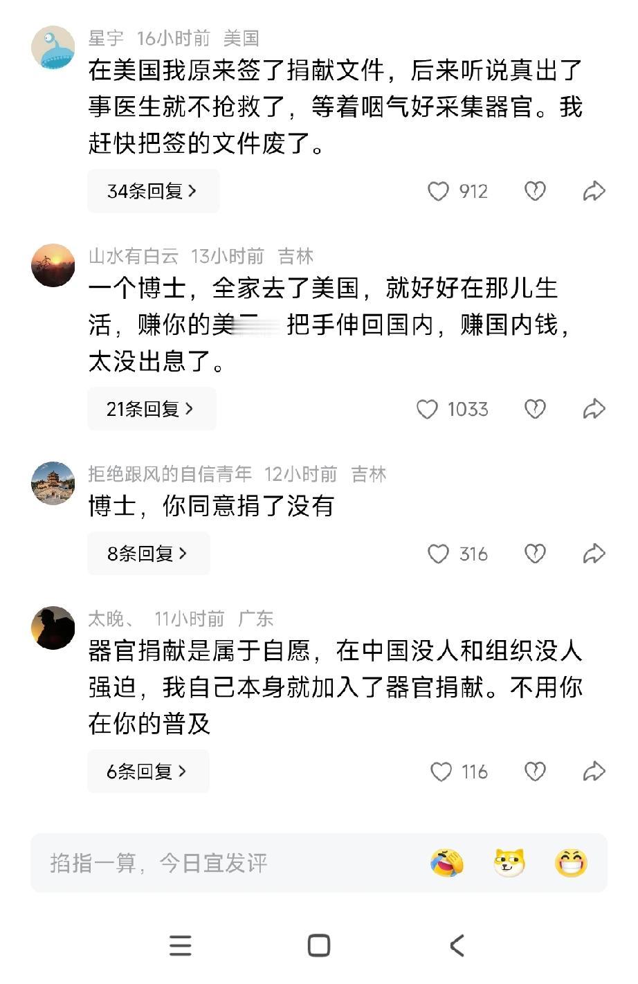 蔡博士说死后捐赠器官是现代文明的共识。 问下蔡博士自己签了捐献器官协议没有? 捐献器官的确是文明。 大家担心美国利用这个文明的规则干野蛮的事情,这才是大家批判的。 在美国生活的华人看到蔡子博士的文章后表示,在美国我原来签了捐献文件,后来听说真出了事医生就不抢救了,等着咽气好采集器官。我赶快把签的文件废了。 华人担心被见死不救,他的担心是有道理的。美国做事一直双标,虚伪,这是世界公认的! 据美国Volza数据,美国在人体组织出口领域排名第一,远超墨西哥和土耳其。企业Medcure每年出售或出租约1万个身体部位,其中20%用于出口。 美国企业出口贩卖的这些器官从哪里来的,没人能讲的清楚,也没有相关的组织去调查监督,就是一笔糊涂账! 事实上美国对捐献人体器官销售缺乏严格监管造成的,允许对人体器官的“加工”收取“合理费用”,这就是美国利用文明干野蛮事的证据! 牢A爆料美国人体器官乱象一事并不是凭空捏造,他自己本人就是从事医学相关工作的。在美国期间老他去各个宗教场所都捐钱,跟社区里的人打成一片。做了大量的实地调查,所以网友相信他说的。