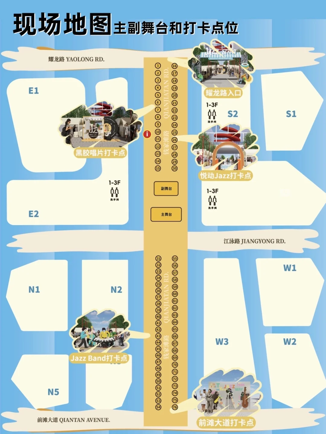 📍主战场:前滩公园巷(主/副舞台)、前滩休闲公园(公园舞台)、晶耀前滩、前滩太古里、前滩31,前滩公园巷氛围最绝!