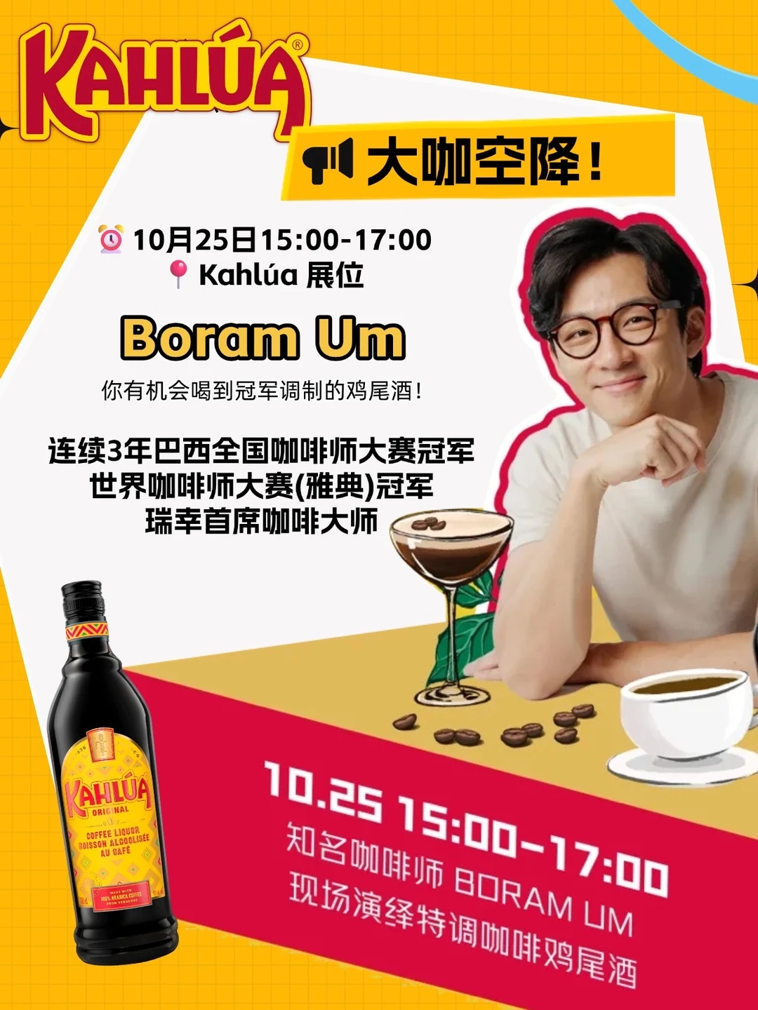 10月25日 15:00-17:00,连续三年巴西全国咖啡师大赛冠军,帅哥咖啡师 Boram Um 会来现场!他可是瑞幸首席咖啡大师,之前线下活动挤爆全场,这次会调独家咖啡利口酒特调,只有 40 人份,想喝的一定要掐点去,还能和帅哥咖啡师合影!
