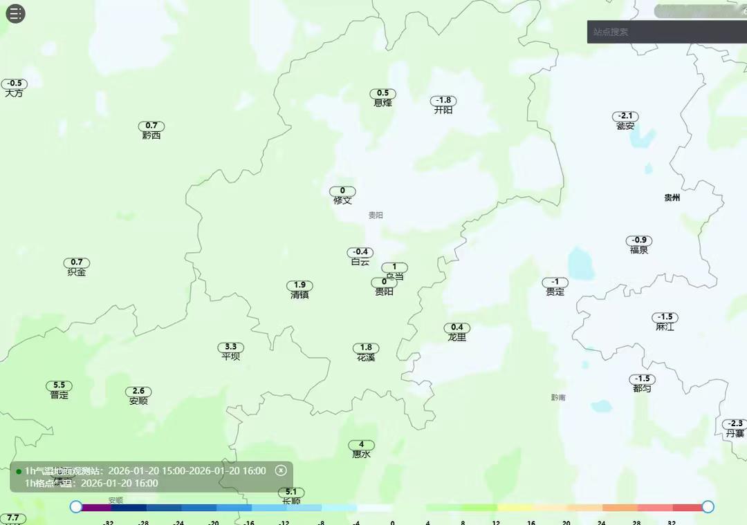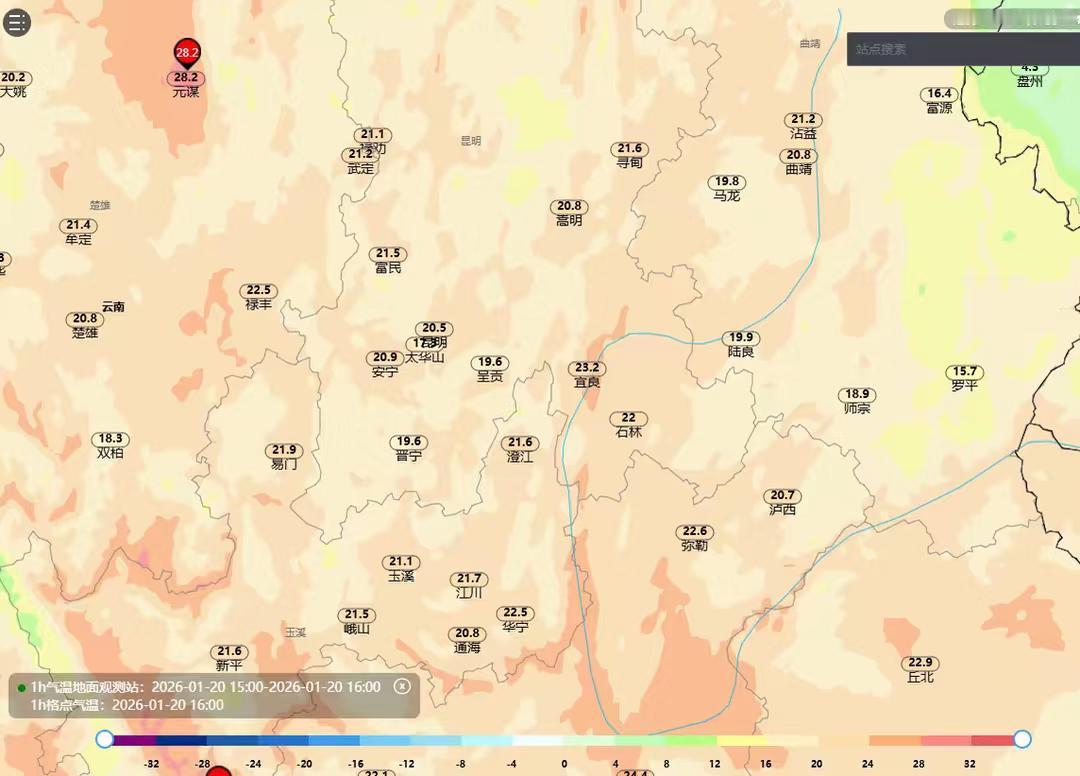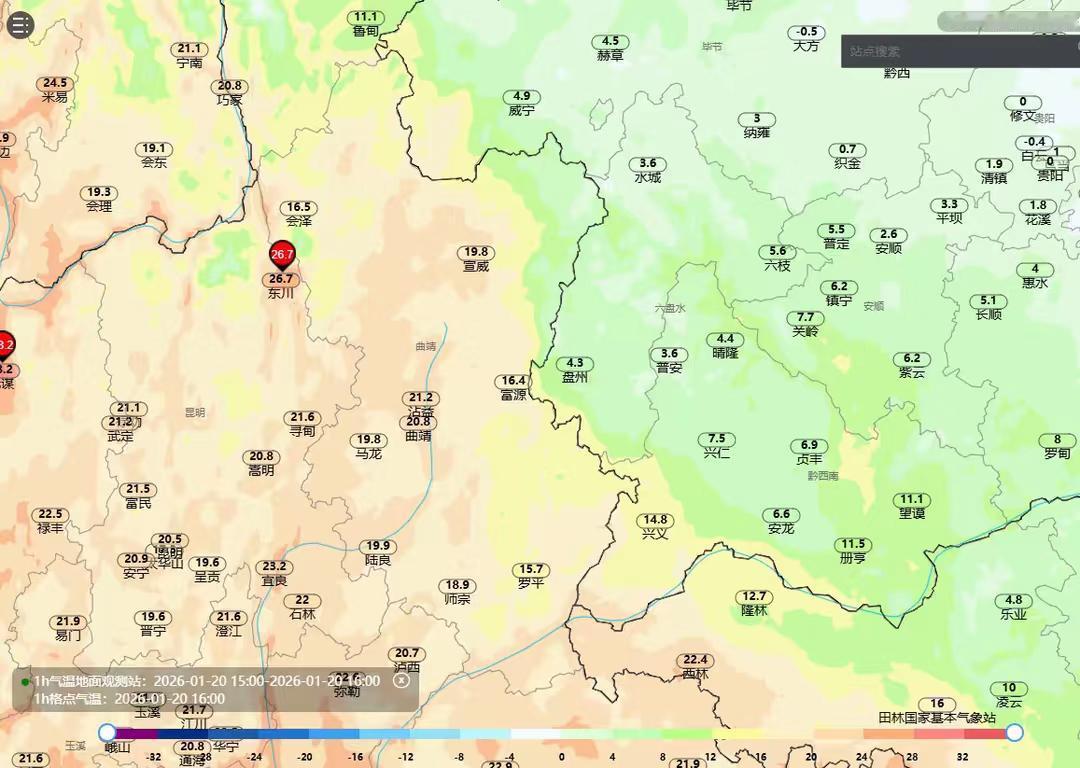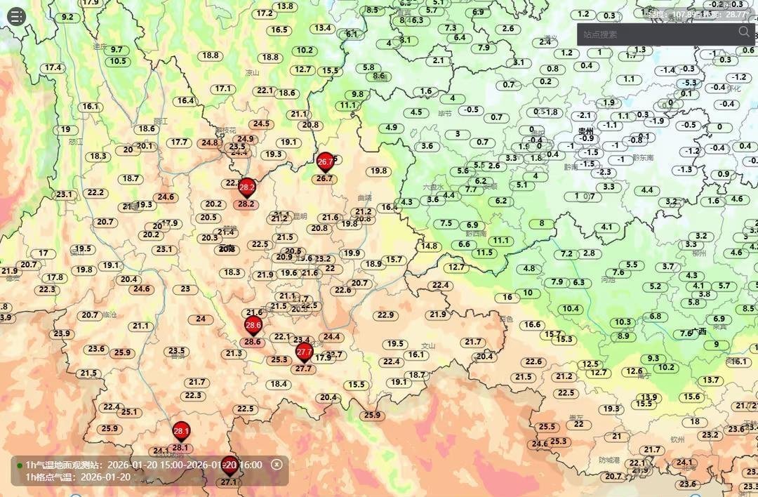 云贵准静止锋两侧冰火两重天 🌞🌨️1月20日受到寒潮影响,贵州除了兴义全部进入冷冻模式,贵阳气温仅为0℃、遵义0.8、铜仁-0.3、凯里-1.0、都匀-1.5、安顺2.6、毕节4.0、六盘水3.6,铜仁、黔东南、黔南都出现了降雪。只有兴义比较温暖有14.8℃。而静止锋另一侧的云南昆明气温20.5℃,通过图六可以看到乌蒙山两侧气温差异,贵州盘州4.3℃,而另一侧云南富源16.4℃,云南宣威19.8℃,贵州水城3.6℃,温差十几度。云南最北侧的昭通也有9.8℃,香格里拉9.7℃。大理19.3℃,丽江18.6℃,玉溪21.1、西双版纳28.1℃,而干热河谷中的元江28.6℃,元谋28.2℃甚至超过了海南成为这会儿最热的站点,不过云南也有准静止锋以西的昭通镇雄最低气温只有-0.6℃,出现了雨夹雪贵州 贵阳 下雪 云南 昆明 玉溪 大理 丽江 香格里拉