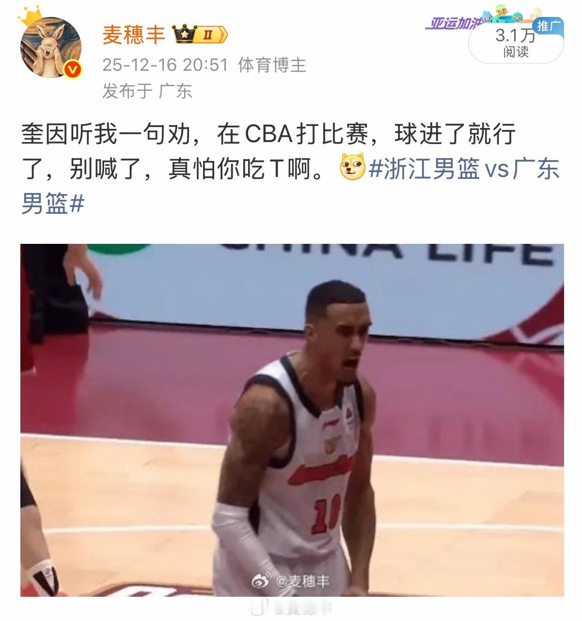之前就跟奎因说了,你在广东打球别喊,一定吹你,在别的队另说。吉林男篮vs广东男篮