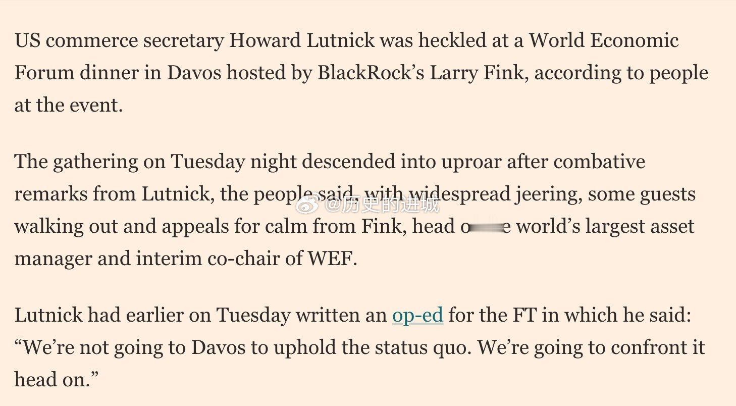 FT报道,据与会人士透露,美国商务部长卢特尼克在达沃斯世界经济论坛晚宴上遭到嘲讽,现场一片嘘声,一些宾客愤然离场。此前,卢特尼克在FT上曾发表文章,称“我们来到达沃斯,就是要把一件事说清楚:自从有了特朗普总统,资本主义就有了新的话事人”。