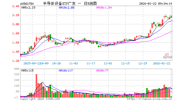 1月22日,半导体设备ETF广发(560780)开盘涨1.49%,报2.180元。半导体设备ETF广发(560780)重仓股方面,中微公司开盘涨1.18%,北方华创涨1.14%,长川科技涨0.94%,沪硅产业涨1.83%,华海清科涨2.14%,拓荆科技涨1.53%,安集科技涨2.55%,南大光电涨1.05%,芯源微涨1.28%,中科飞测涨1.35%。