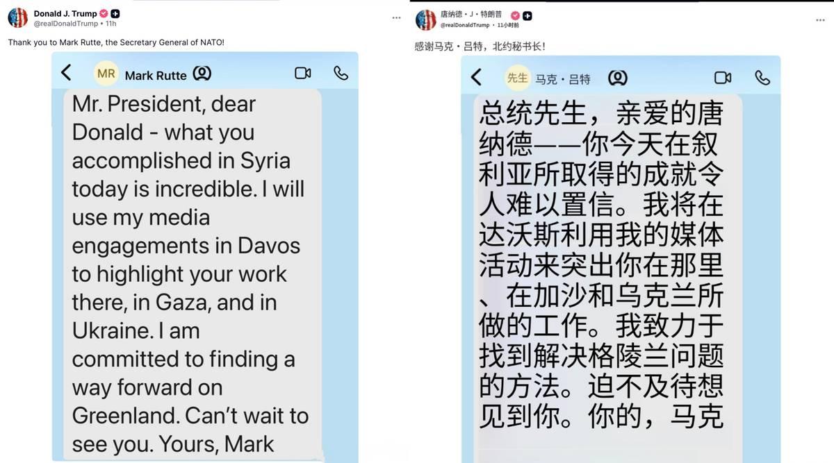 被特朗普曝光谄媚丑态后,北约秘书长又炒“中国威胁”,高志凯说的是对的:“他似乎没有智力” 据多家外媒报道,当地时间20日,在晒出了马克龙发送的短信后,特朗普又在社媒上公开了不少欧洲政客发给他的短信,其中最谄媚的,当属北约秘书长吕特的信息——他以极其献媚的措辞称赞了特朗普在叙利亚的成就,还说要在达沃斯论坛上,重点向记者们宣传特朗普在在叙利亚问题、加沙问题、乌克兰问题上取得的成功,最后说自己致力于找到解决格陵兰问题的办法,并已经迫不及待见到特朗普。 这已经是吕特第二次被特朗普公开私人短信了,两次沟通的内容虽然不同,但是那副谄媚的丑态却是丝毫未变,这也让吕特再次成为了西方记者和网友们嘲讽的对象。有主持人就在达沃斯论坛上贴脸开大,公开问吕特“你介意爸爸分享你的短信吗?(吕特曾称特朗普为爸爸)”,吕特只能以尴尬大笑来试图转移话题。 随后,或许是恼羞成怒,吕特再次炒作起了”中国威胁论”,并且宣称,他认为特朗普是对的,北约需要从中国和俄罗斯的手中保卫北极,因为8个北极国家中,7个都是北约成员国,只有俄罗斯是例外,而第9个国家就是中国(原话如此,他没有解释这第9个国家是怎么来的)。 这也再次印证了中国学者高志凯在前几天接受外媒采访时的结论:令人惊讶的是,北约秘书长似乎没有智商,他根本不是北约秘书长,而是美国在北约的代表。