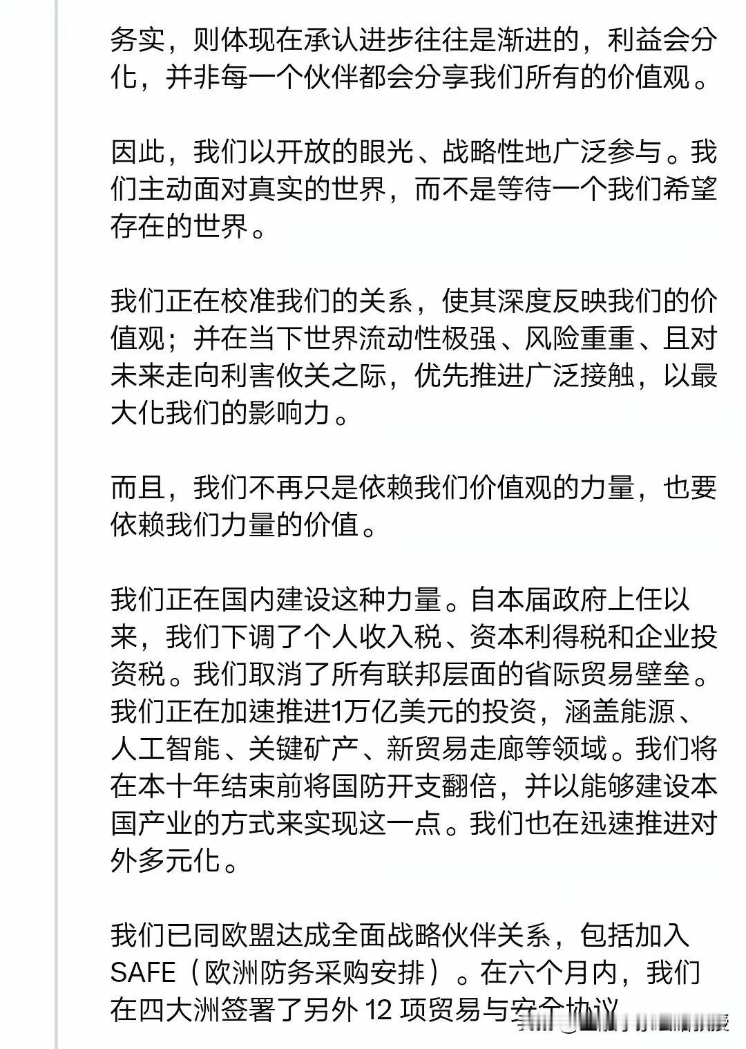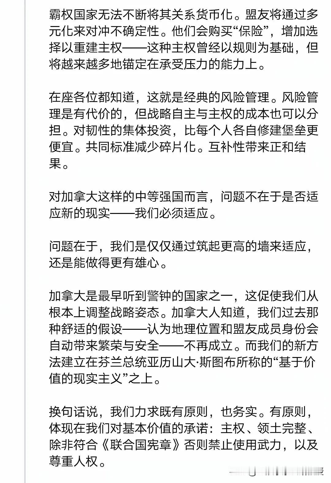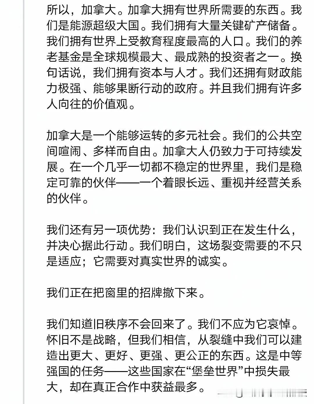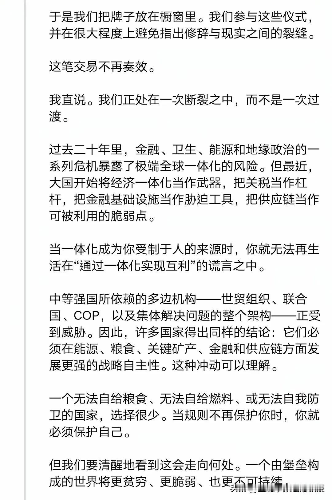 加拿大总理卡尼成欧美觉醒标杆!中国是关键钥匙,达沃斯演讲直言要掀翻旧秩序。 加拿大总理卡尼堪称近些年来欧美阵营最具代表性的醒悟领导人,没有前些日子来中国访问,中国带来的稳定合作参照,或许就没有他这场振聋发聩的演讲! 在这场达沃斯论坛上,他5大核心表态直击要害: 1. 直言“旧秩序已终结,怀旧不是策略”; 2. 痛批大国将经济一体化当武器; 3. 宣告“中等强国不在谈判桌,就在菜单上”; 4. 坚持与中国建战略伙伴关系; 5. 呼吁盟友拒绝做霸权附庸。 卡尼这番硬核发言引爆全场,欧美觉醒信号拉满!我们还看到德国总理,法国总统的发言都令人为之一震。霸权时代终会落幕,多极世界大势已势不可挡。