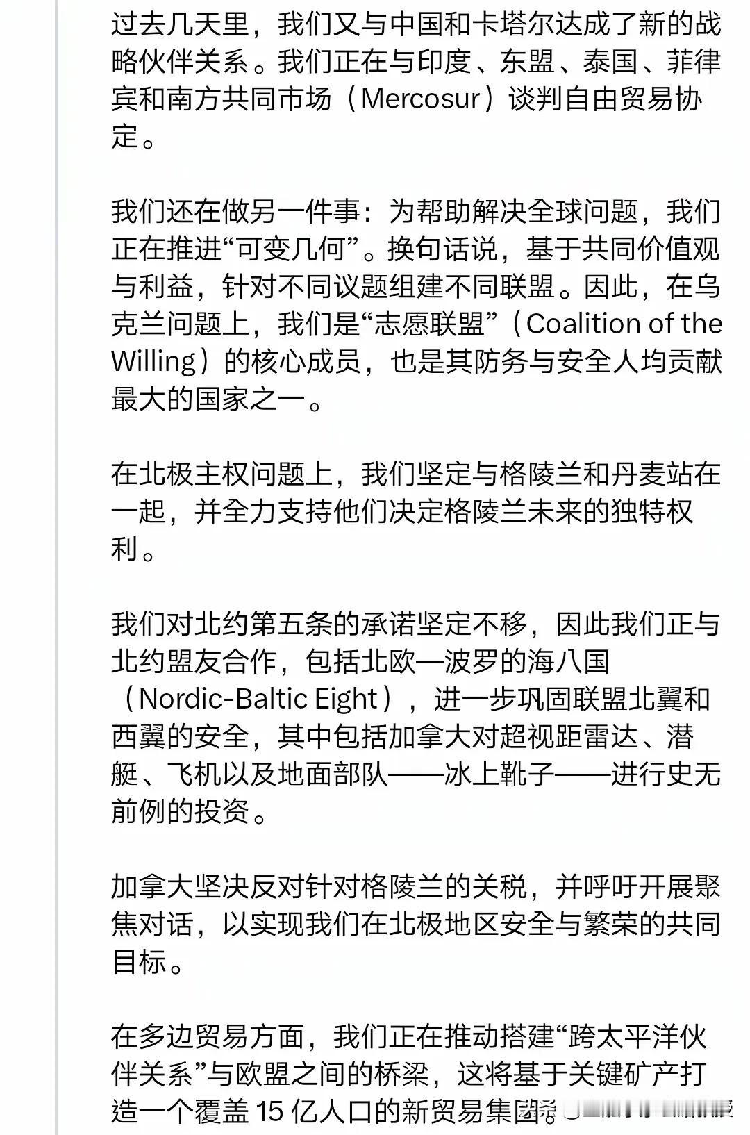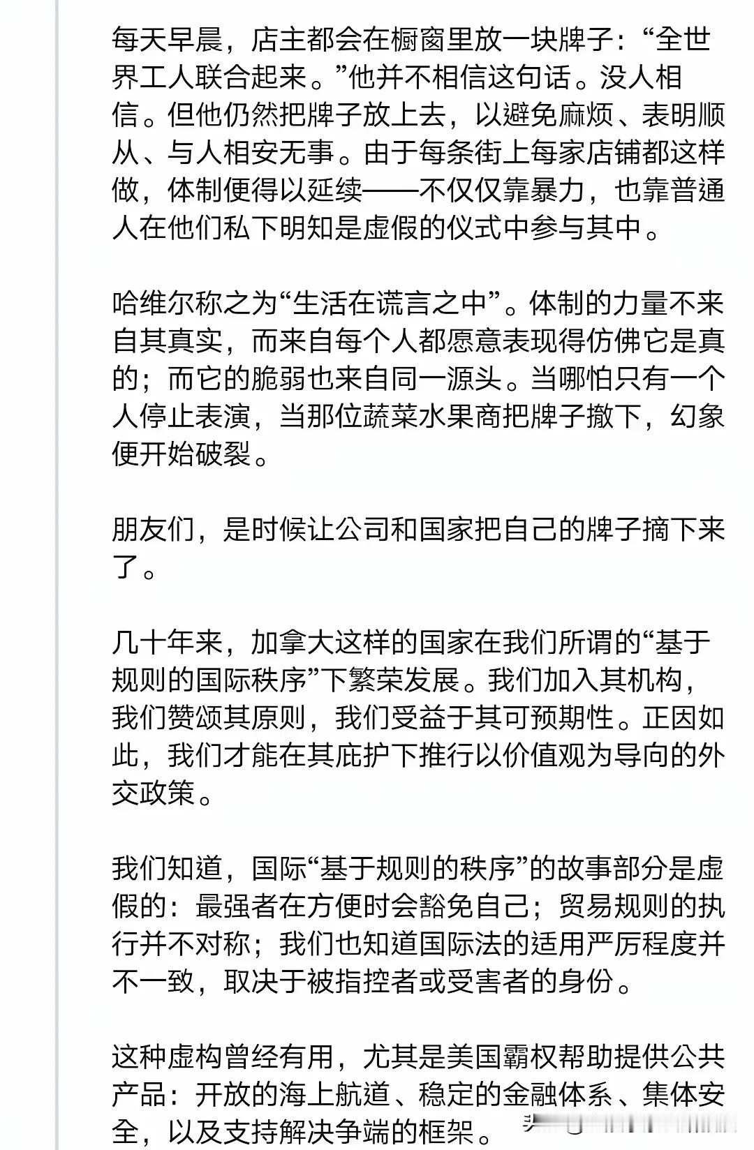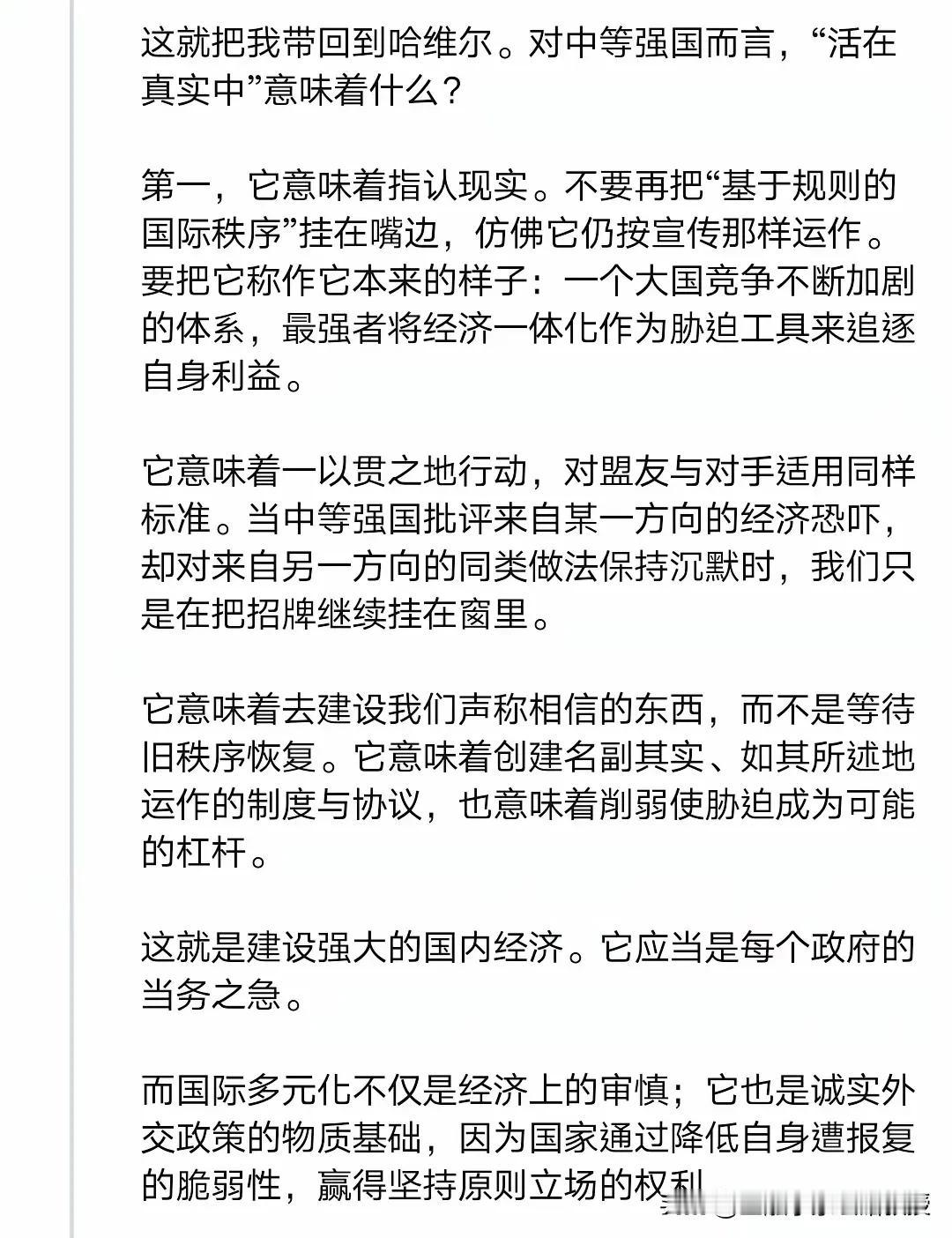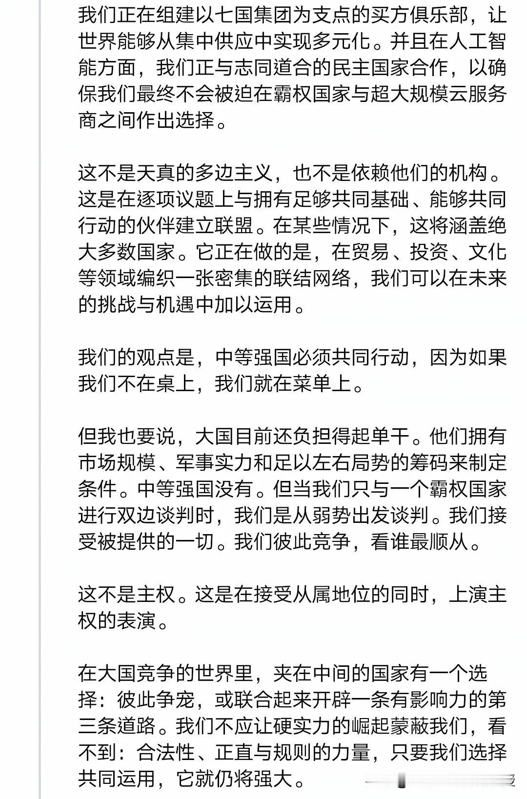加拿大总理卡尼成欧美觉醒标杆!中国是关键钥匙,达沃斯演讲直言要掀翻旧秩序。 加拿大总理卡尼堪称近些年来欧美阵营最具代表性的醒悟领导人,没有前些日子来中国访问,中国带来的稳定合作参照,或许就没有他这场振聋发聩的演讲! 在这场达沃斯论坛上,他5大核心表态直击要害: 1. 直言“旧秩序已终结,怀旧不是策略”; 2. 痛批大国将经济一体化当武器; 3. 宣告“中等强国不在谈判桌,就在菜单上”; 4. 坚持与中国建战略伙伴关系; 5. 呼吁盟友拒绝做霸权附庸。 卡尼这番硬核发言引爆全场,欧美觉醒信号拉满!我们还看到德国总理,法国总统的发言都令人为之一震。霸权时代终会落幕,多极世界大势已势不可挡。