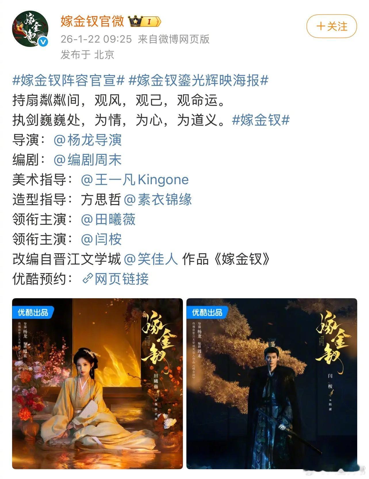 《嫁金钗》阵容官宣领衔主演:田曦薇 领衔主演:闫桉 嫁金钗阵容官宣田曦薇嫁金钗定