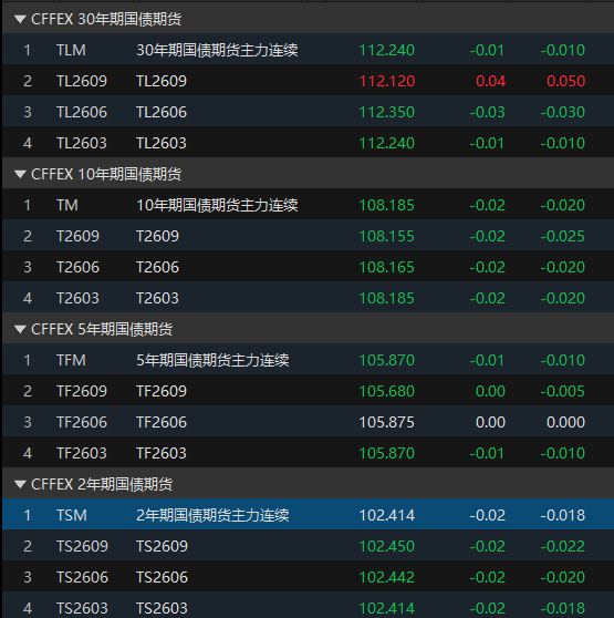 上证报中国证券网讯1月22日,国债期货早盘收盘全线下跌,30年期主力合约跌0.01%,10年期主力合约跌0.02%,5年期主力合约跌0.01%,2年期主力合约跌0.02%。