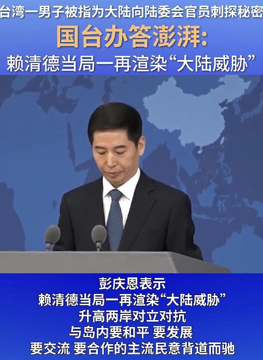 台湾男子为大陆刺探秘密?国台办回应 1 月 21 日国台办例行新闻发布会上,有关于台湾一乔姓男子被指为大陆向陆委会官员刺探秘密一事引发关注。国台办发言人彭庆恩回应,赖清德当局总渲染“大陆威胁”,升高两岸对立,这和岛内求和平、发展、交流、合作的主流民意对着干,不得人心。 同时发布会上还提及美台关税谈判,美胁迫台湾大幅增加投资,掏空其优势产业。民进党当局还把这“砸锅卖铁式妥协”美化,妄图蒙骗民众。民进党当局这些操作,就是在损害台湾民众利益,把台湾往火坑里推。
