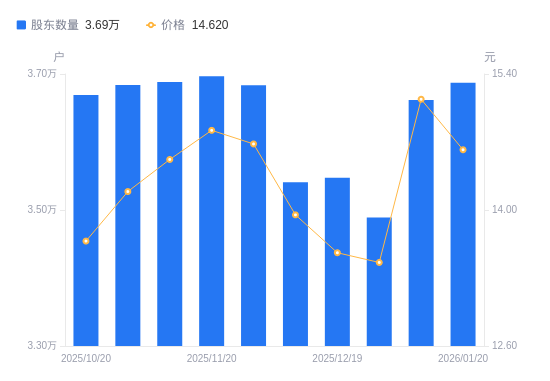 日期A股户数(户)流通A股户均持股数(股)户均持股市值(万元)2026-01-20368736958.1910.172026-01-09366197006.4610.612025-12-31348887354.099.902025-12-19354747232.609.812025-12-10354087246.0910.112025-11-28368336965.7510.232025-11-20369676940.5010.292025-11-10368836956.3010.102025-10-31368376964.999.882025-10-20366926992.529.57