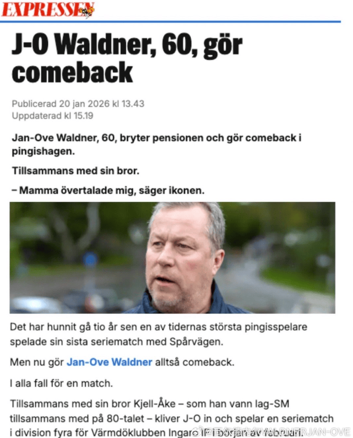 虎扑01月22日讯据悉,现年61岁的瑞典乒乓球传奇瓦尔德内尔近日宣布在瑞典丁级联赛复出,这位乒坛名将将代表英厄勒乌俱乐部出战对阵布奥俱乐部的焦点德比战。在采访中,他说道:“是老妈催着我来参赛的,我没有办法拒绝。”