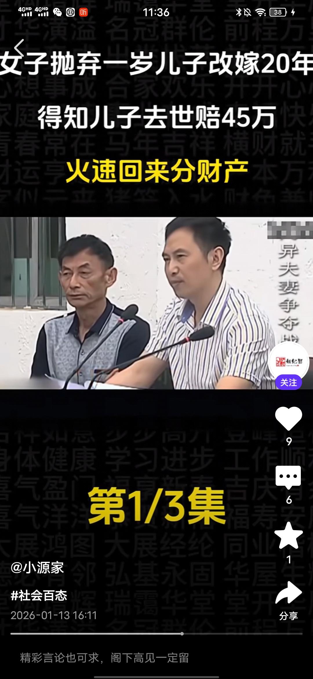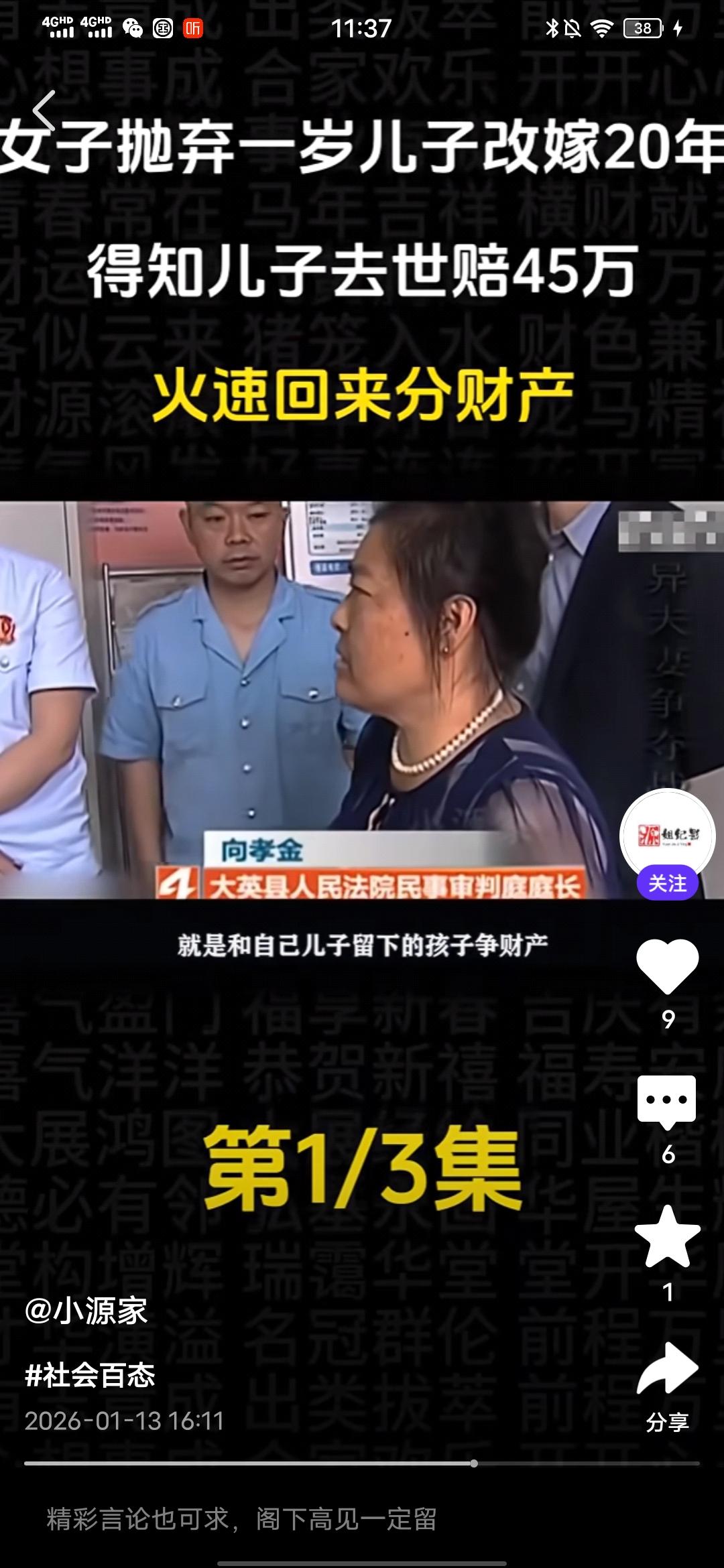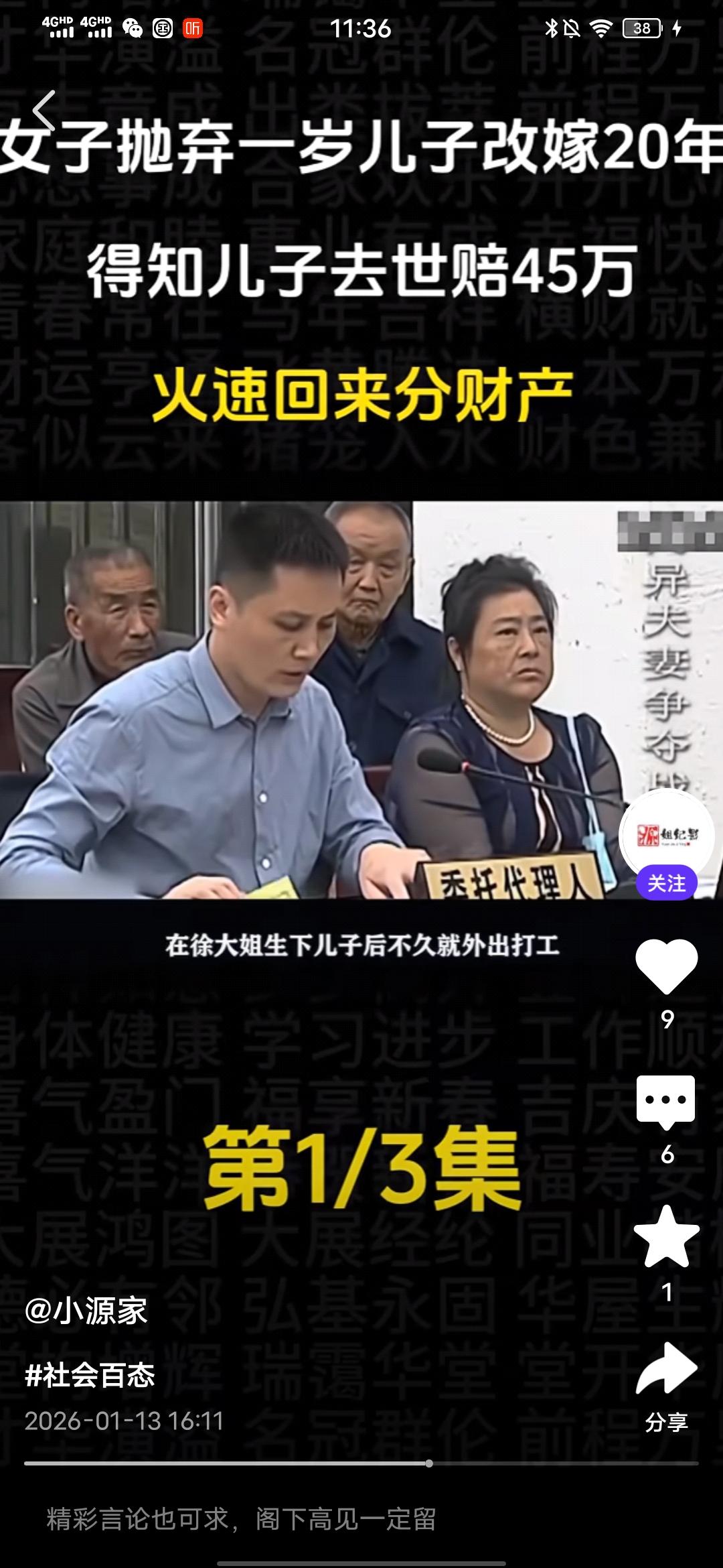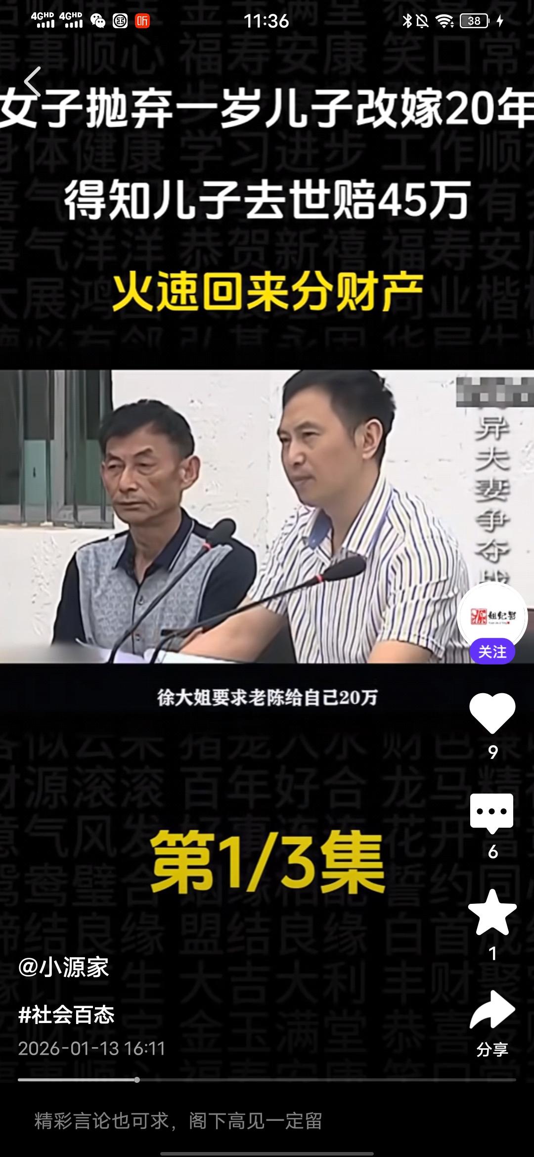 气死我了,真想骂她几句好的! 刚在一个媒体平台看到一个真人纪实事件,一个女的抛弃一岁儿子改嫁20年,得知儿子意外去世获赔45万,火速回来分财产! 真是恬不知耻,这个抛夫弃子的女人叫徐金蓉,在孩子1岁的时候就跟孩子父亲老陈离婚了,此后就对孩子不闻不问,如今24年过去了,去年儿子意外去世,获赔45万元,知道这个事情的徐金蓉火速赶回来企图分这笔赔偿款。这让老陈十分气愤,这笔钱本来打算留给儿媳和孙子的,孙子还小,以后上学,生活都有要钱。 可是,前妻徐金蓉突然跑回来闹着要分走一半,这打乱了老陈的计划,他认为这笔钱没有1分钱是属于徐金蓉的,结果这徐金蓉居然恬不知耻地将老陈告上法庭,调解席间,老陈变态,最多给她1万,多的一分都不要想,徐金蓉却狮子大开口说至少20万。 老陈气得不行,质问她,儿子在抢救期间,到最后葬礼期间,你面都没露一下,有你这样的母亲?这个徐金蓉却有自己的借口,说的自己有糖尿病,在外地住院,而且,她也表示,她现在赚不到钱,就想着分这笔钱给自己看病,可笑不?就算老陈的儿子在抢救时,或是葬礼时徐金蓉都到了现场,她也没有资格分,人家有老婆,孩子,更重要的是,她在孩子1岁时就离开了,没有尽过抚养的责任,她不配! 后来调解员都说,你这样是在跟孙子抢财产,这徐金蓉居然说,所以以后长大自己挣钱,搞笑不?这人眼里都只有钱,没有丝毫人性和羞耻之心,不要脸的人真的是谁也没有办法!希望最后,法院能给个公正的判决,不要让这姓徐的得逞,不要寒了安守本分之人,扛起责任之人的心,更不要让效仿徐金蓉这样的烂人的人有机会钻空子! 祝愿好人有好报,恶人、烂人有恶报!