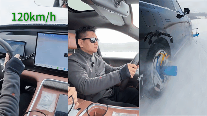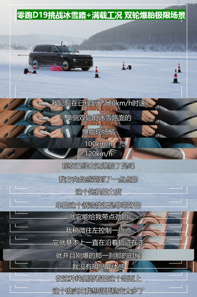 零跑 D19 在-30℃ 的冰雪低附着路面上,直接进行双轮同时爆胎实测,不同于其