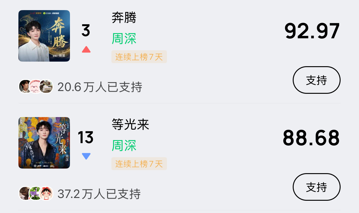 周深📣 1.22 巅峰潮流 📣米米们下午好,每歌做6个动作路径:Q音-乐馆-排行-潮流巅峰✅《奔腾》✅《等光来》完成『支持』让更多人听到深深