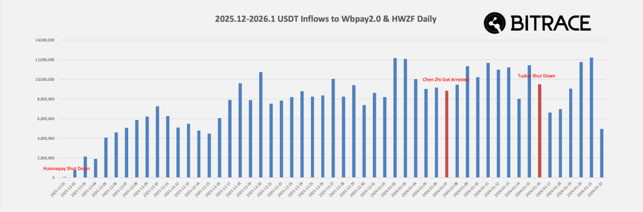 吴说获悉,据Bitrace监测,尽管汇旺支付(Huionepay)和土豆担保已关闭,但依赖其服务的网赌实体仍在全面运营。过去53天内,这些相关实体共接收了4.14亿USDT的收入。情报显示,汇旺TG钱包、旺博钱包和HWZF(海外支付)是其主要的资金结算工具,且旺博钱包与汇旺支付疑似使用同一SaaS后端,资金被归集在一起。此外,尽管支付平台多次警告,过去53天仍有900万USDT资金直接流入OKX、Binance和HTX等主流交易所。