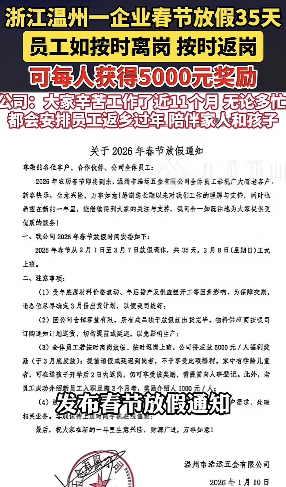 温州一五金厂车间门口,一张放假通知把路过的师傅们钉住了脚。 红纸黑字写着春节假——2月1日到3月7日,整整35天,底下还附一行:按时返岗奖5000元。 这家厂做五金加工,老板张有运干过理发师、跑过销售,11年前开始贴这通知,哪怕疫情三年,奖金一分没少。几个师傅围着看,有人揉眼睛确认“5000”后面没小字,结果真没有附加条件 。 不止放假长,工资比同行高三成,家有学龄娃的,能晚两天返岗还拿全奖;老员工介绍新人干满三个月,给1000元介绍费。 很多人纳闷,制造业靠赶工赚钱,这家厂反其道而行,张有运说,以前跑销售时就信“有钱大家一起赚”,哪怕利润薄,也让利给客户,所以订单总排前面。现在把这理念用在员工身上,近50%利润都发成工资福利。 有老员工算过账:自己在这干了8年,每年春节能陪孩子整个寒假,去年孩子开学前两天返岗,奖金没扣。隔壁厂的师傅羡慕得不行,说“我们年初二就开工,他们还在陪爸妈”。 企业HR说,这政策下来,员工流动率不到5%,比同行低一半。去年旺季赶订单,没人请假,大家主动加班,效率比平时高两成。 张有运的“让利”不是傻,是算长期账,五金行业竞争狠,留得住人才能稳质量。员工把厂当自己家,次品率比同行低10%,客户愿意等他们的货。 这两年制造业招工难,很多厂涨工资都招不到人,浩运反而有人主动介绍亲戚来。因为大家知道,老板不是“用员工”,是“和员工一起赚”。 有网友说“35天假,还有奖金,他们老板靠啥赚钱啊,求内部人士爆料!吃瓜”其实老板的赚法藏在细节里,员工不跳槽,省了招聘费;效率高,省了返工费,这些加起来比奖金多。 浩运用35天假换员工的安心,用5000元奖换全年的稳定,用高工资换生产的效率,可这种“先顾人再顾钱”的模式,其他制造业能照搬吗? 要我说,老板不是笨,是摸透了打工的心思,现在谁不想多陪孩子几天,谁不想工资高还能兼顾家庭,浩运把这些都做到了,员工能不拼命干吗?换我是车间师傅,肯定举双手支持。 你觉得这模式能复制吗?