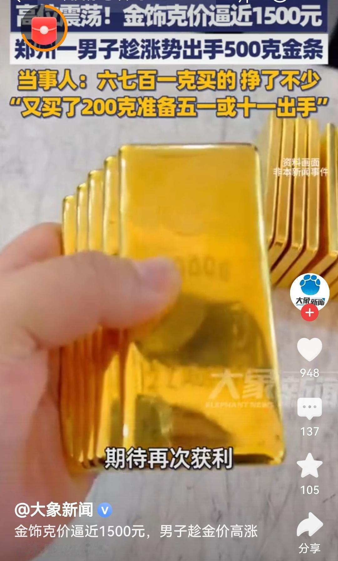 男子卖500克金条:六七百一克买的金价上涨带来了实实在在的收益,这位男子的果断出手,也让我们看到合理规划资产的重要性。理性看待市场波动,做好财富管理,才能在生活中收获更多稳稳的幸福。[烟花][烟花][烟花] 金条市场 评论打卡任务