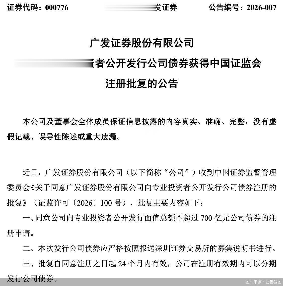 北京商报讯(记者刘宇阳实习生姚榕琰)1月22日,广发证券发布公告称,于近日收到中国证监会批复,同意广发证券向专业投资者公开发行面值总额不超过700亿元公司债券的注册申请。该批复自同意注册之日起24个月内有效,广发证券在注册有效期内可以分期发行公司债券。