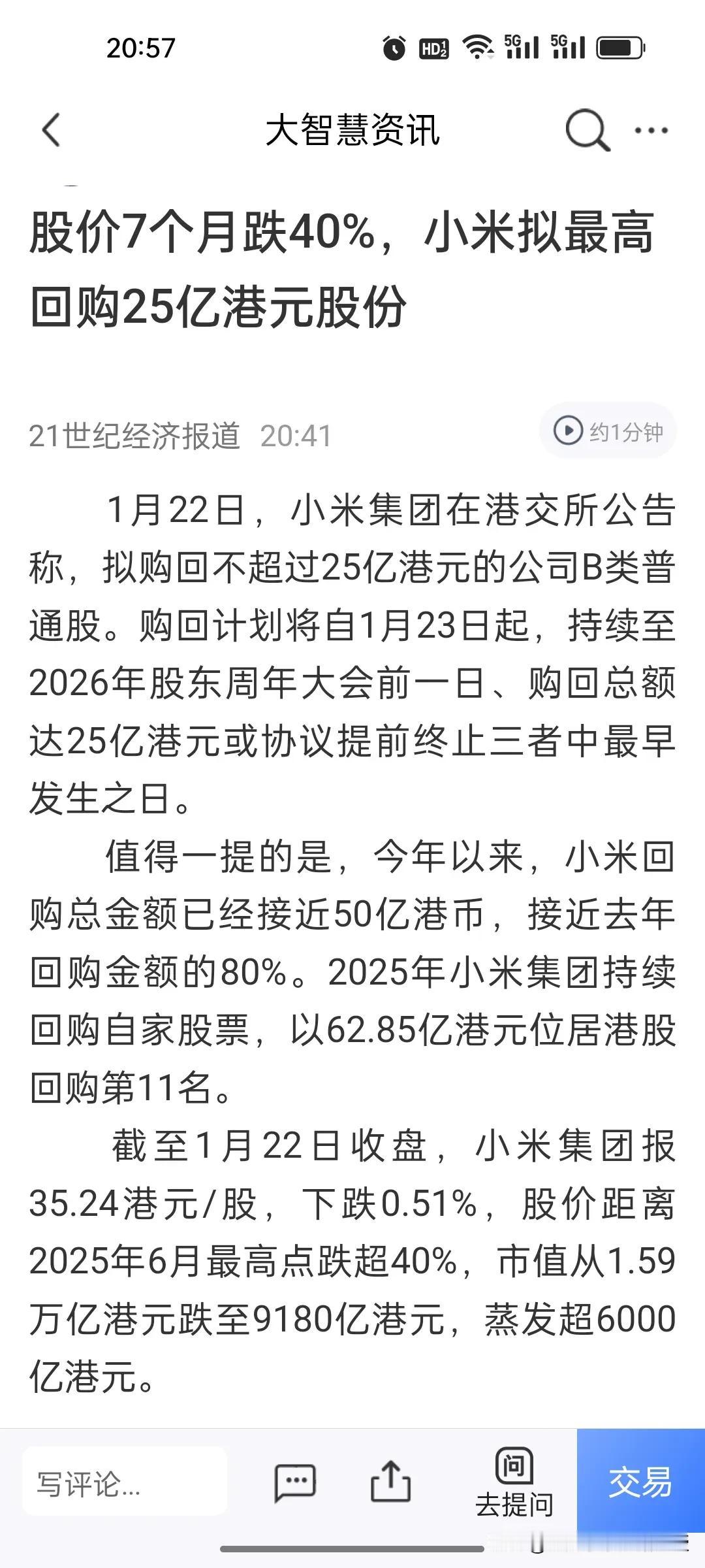 小米狂砸25亿护盘!6000亿市值蒸发的坑,填得动吗? 小米今天甩出25亿港元回购计划,这已经是今年以来的又一次紧急护盘动作。 去年小米砸了62.85亿港元回购,今年才刚开年就已经砸了近50亿,快赶上去年了,可即便如此,股价还是从去年6月的高点跌去了40%,市值直接蒸发超6000亿港元,从1.59万亿缩水到只剩9180亿。不过在每次回购之后,第二天小米的股价都会反弹。 当前消费电子行业整体疲软,高端市场突破不及预期,再加上互联网业务增长乏力,多重压力下股价扛不住也在情理之中。现在的回购更像是一场“信心急救”,但这25亿能不能止住跌势,最终还是要看小米能不能拿出实打实的年报业绩。