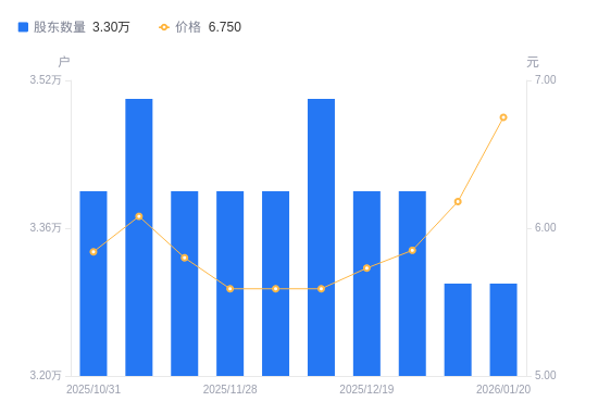 日期A股户数(户)流通A股户均持股数(股)户均持股市值(万元)2026-01-203300025848.9917.452026-01-093300025848.9915.972025-12-313400025088.7314.682025-12-193400025088.7314.382025-12-103500024371.9113.622025-11-303400025088.7314.022025-11-283400025088.7314.022025-11-203400025088.7314.552025-11-103500024371.9114.822025-10-313400025088.7314.65
