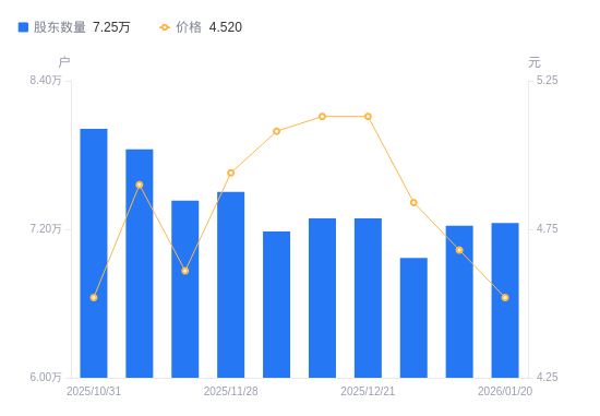 1月21日消息,数据显示,截至2026年1月20日,凤凰航运A股股东总户数为7.25万户,较上期(2026年1月9日)增加213户,增幅0.29%。公司最新A股总股本为10.12亿股,其中流通A股10.12亿股,户均持有流通A股数量为1.4万股,较上期减少41.13股,降幅0.29%;户均持流通A股市值6.31万元,较上期减少2426.03元,降幅3.70%。