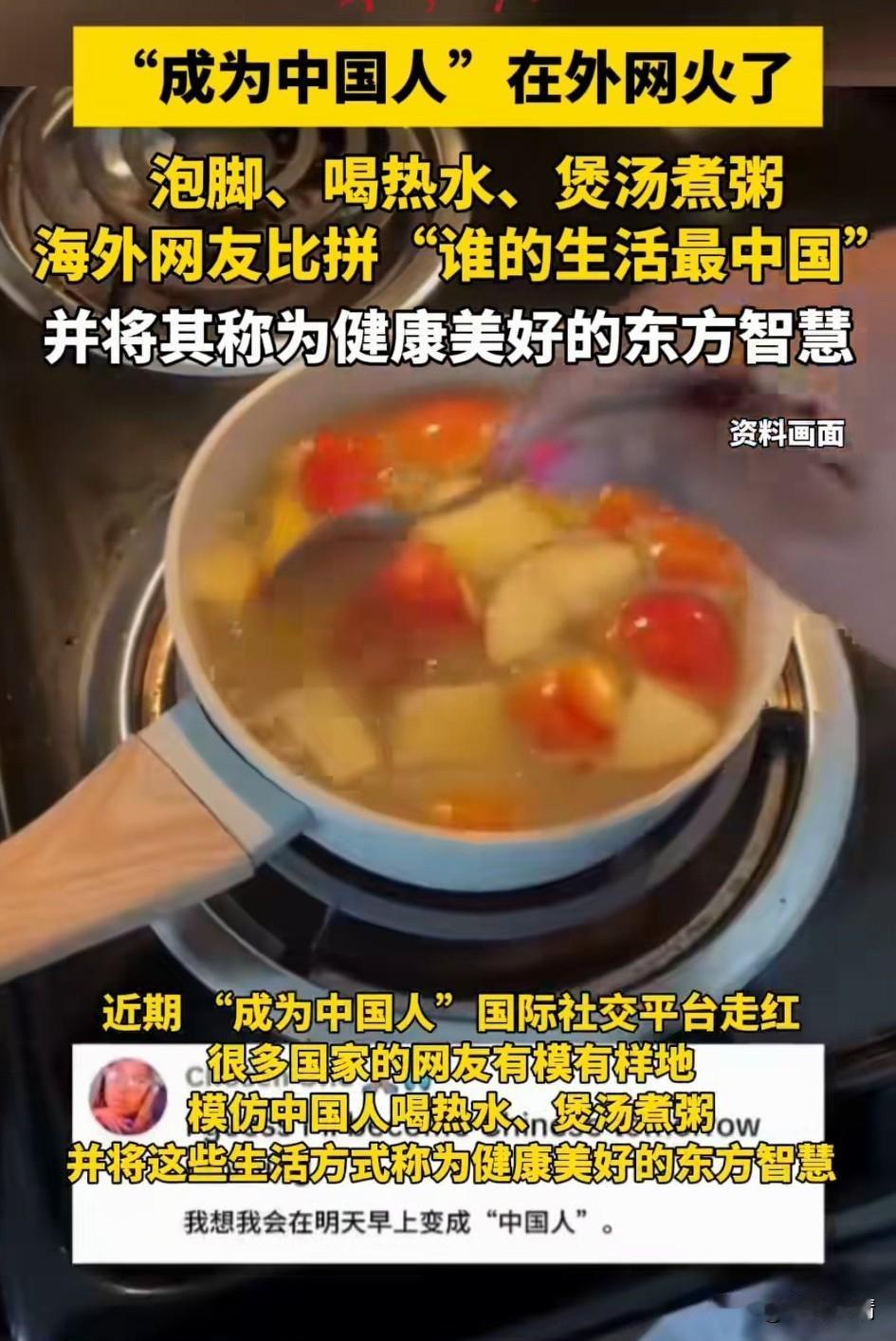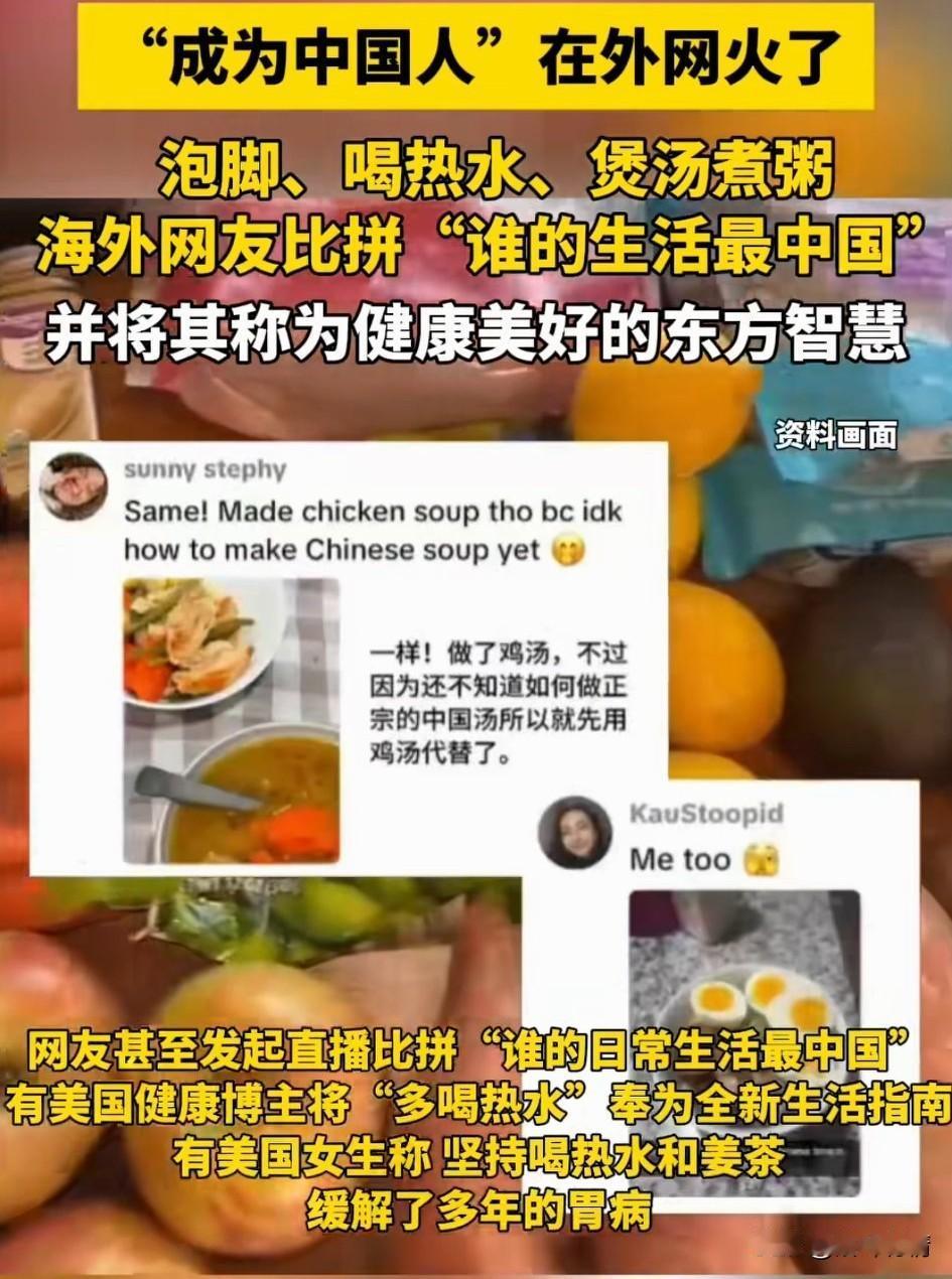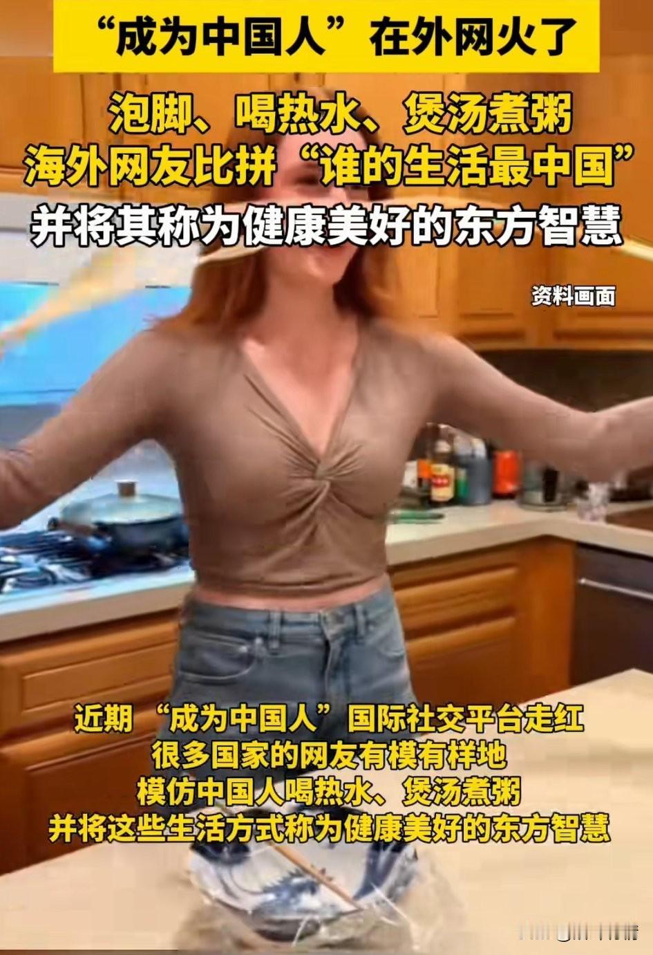 你敢想象成为中国人在外网火了,很多健康博主都开始拍摄自己中国人的一天! 他们有的人开始尝试起来做扯面,还有的开始煲汤,煮粥,更有一些开始煮姜茶喝热水! 很多健康博主都把喝热水作为了新的健康指南,更有美国女网友表示喝点水和姜茶,缓解了多年的胃寒! 大家都把这称之为东方智慧,现在互联网都开始比拼谁的生活像中国人?就连中国泡脚的智慧也被他们学了过去! 大家都知道以前老板是不喝热水的,他们都是喝冰水,就算生孩子之后也是如此,也根本没有坐月子一说! 这导致他们都有隐疾,年轻的时候还不显,到中老年之后才觉得身体不舒服,如今他们终于找到了病根,现在都开始学习中国人养生! 所以说互联网改变了老外当代人的生活,喝热水确实是一个好的健康习惯,大家对于国外兴起这股成为中国人热潮这事怎么看? 老外的那些事 老外说中国人 老外评价中国人 当代人健康状态