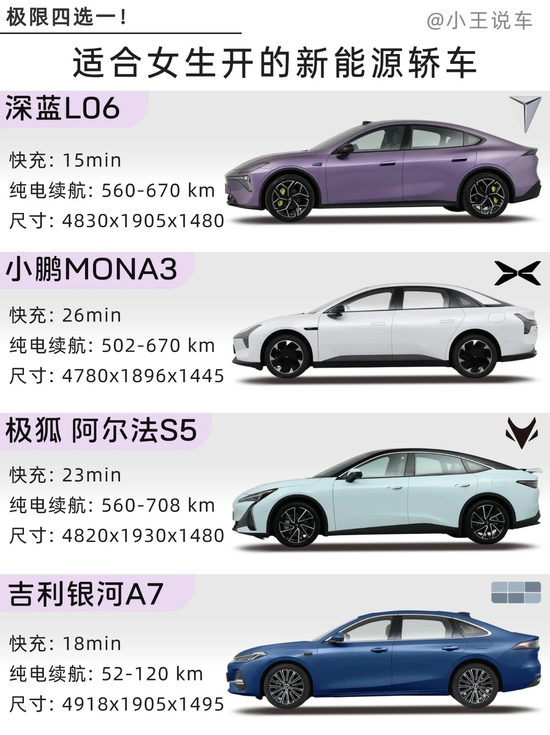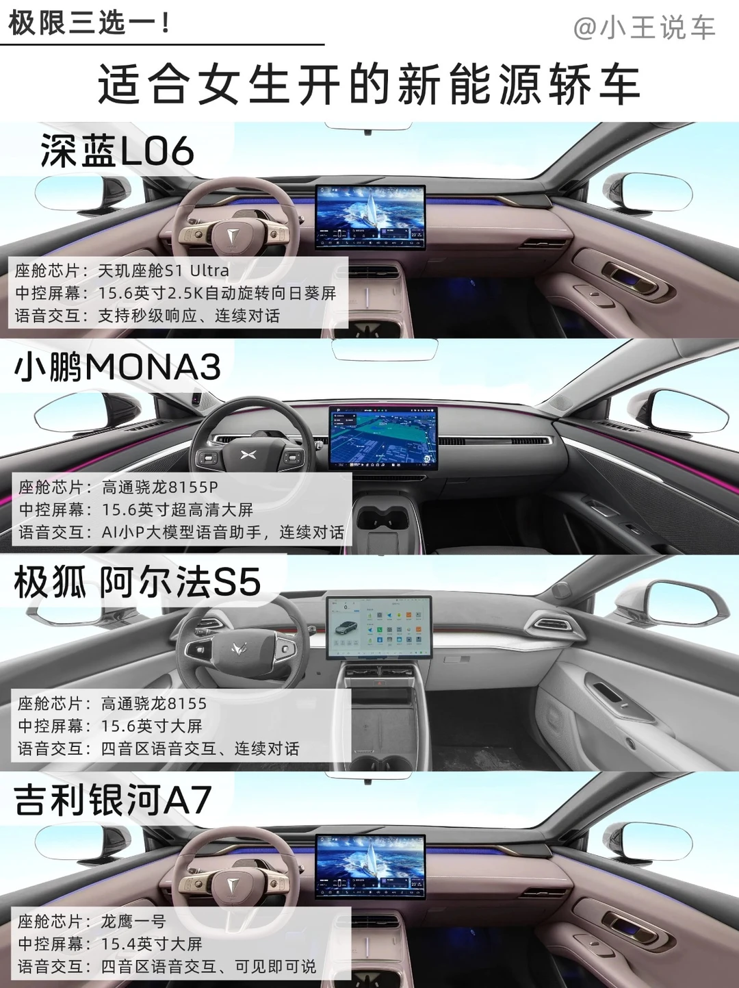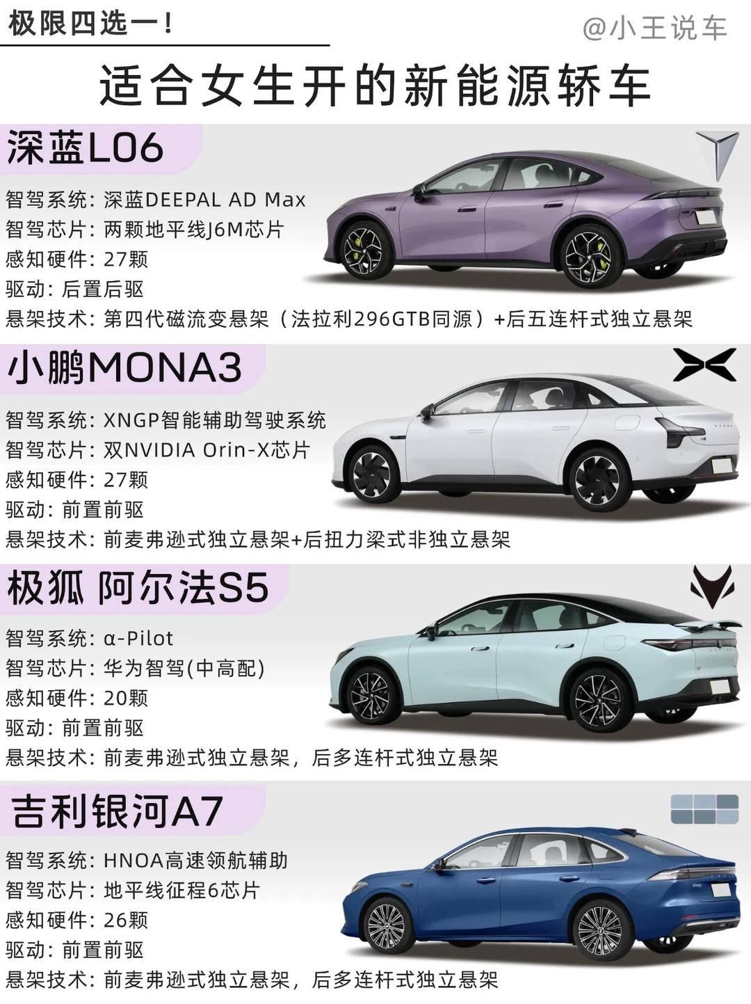 💡想要追求高颜值、操控和智能体验的女生选深蓝L06,配备300万法拉利同款磁流变悬架,高效调节路面震动,更好过滤减速带和坑洼路的颠簸感,过弯也稳稳当当~💡喜欢灵动外观、主要用于市区通勤的选小鹏MONA3;💡注重稳妥实用和高性价比选极狐阿尔法S5,预算有限且想要家用选银河A7