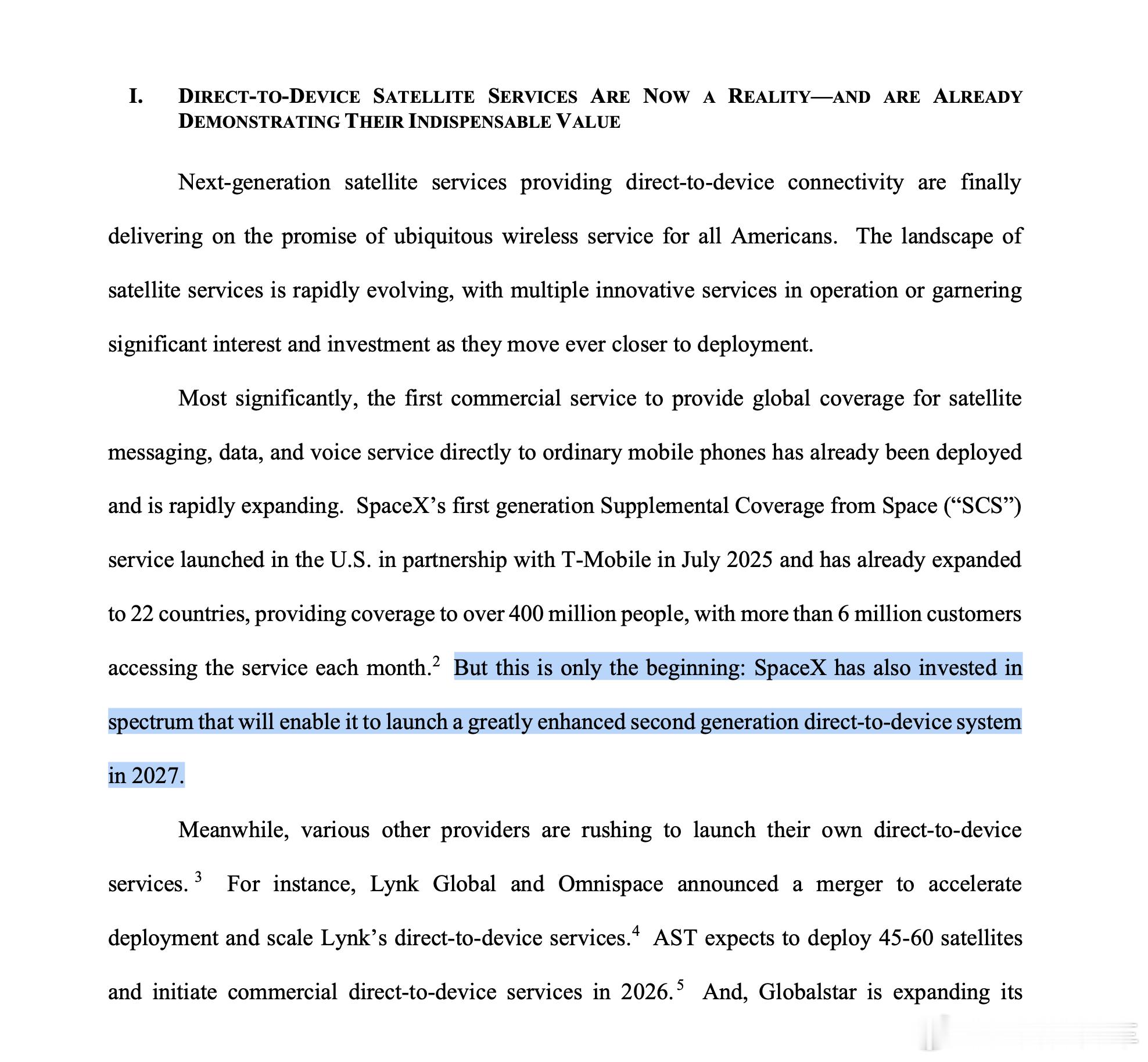 SpaceX公司向FCC提交的最新文件显示,目标是在2027年推出第二代Starlink服务。目前 SpaceX的第一代 Starlink 服务覆盖超过4亿人口,月活用户超过 600 万用户。SpaceX 还拓展了通讯频谱段,预计在2027年将推出功能更多、性能更强的第二代Starlink服务,届时第二代Starlink可实现「手机直连卫星」上网、短信、通话,且无需其他地面终端接收硬件。SpaceXStarlink