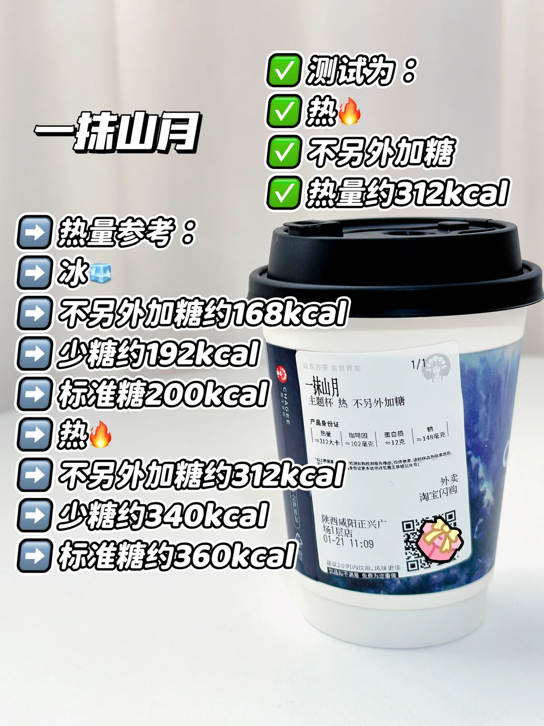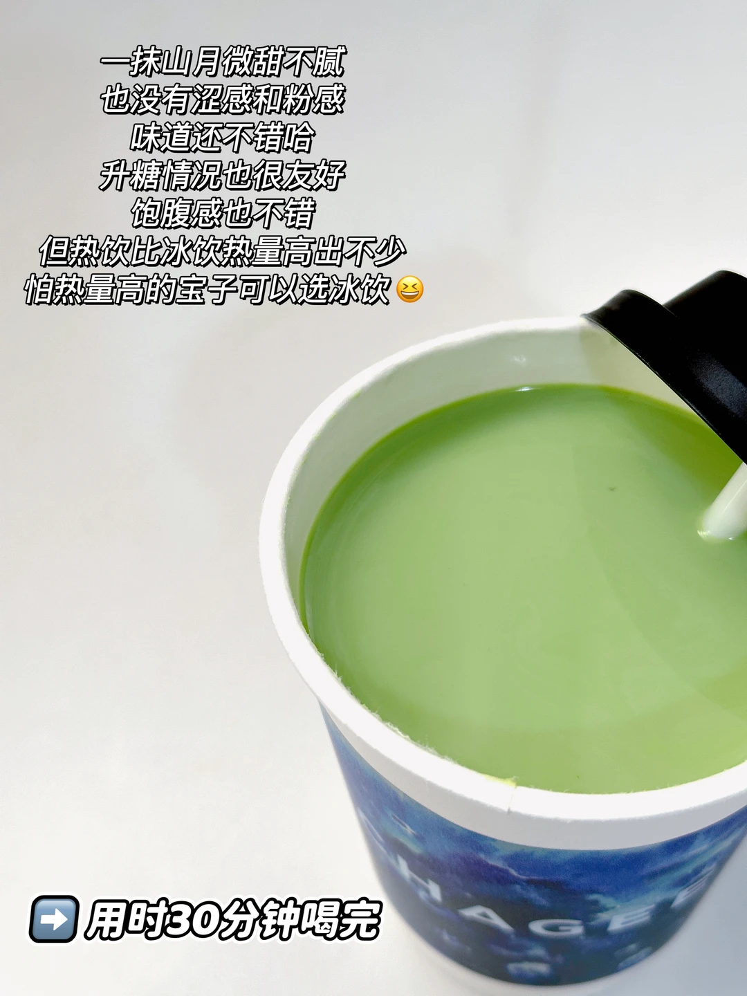 一抹山月微甜不腻,也没有涩感和粉感,味道还不错哈〰️升糖情况也很友好,饱腹感也不错,但热饮比冰饮热量高出不少,怕热量高的宝子可以选冰饮😆