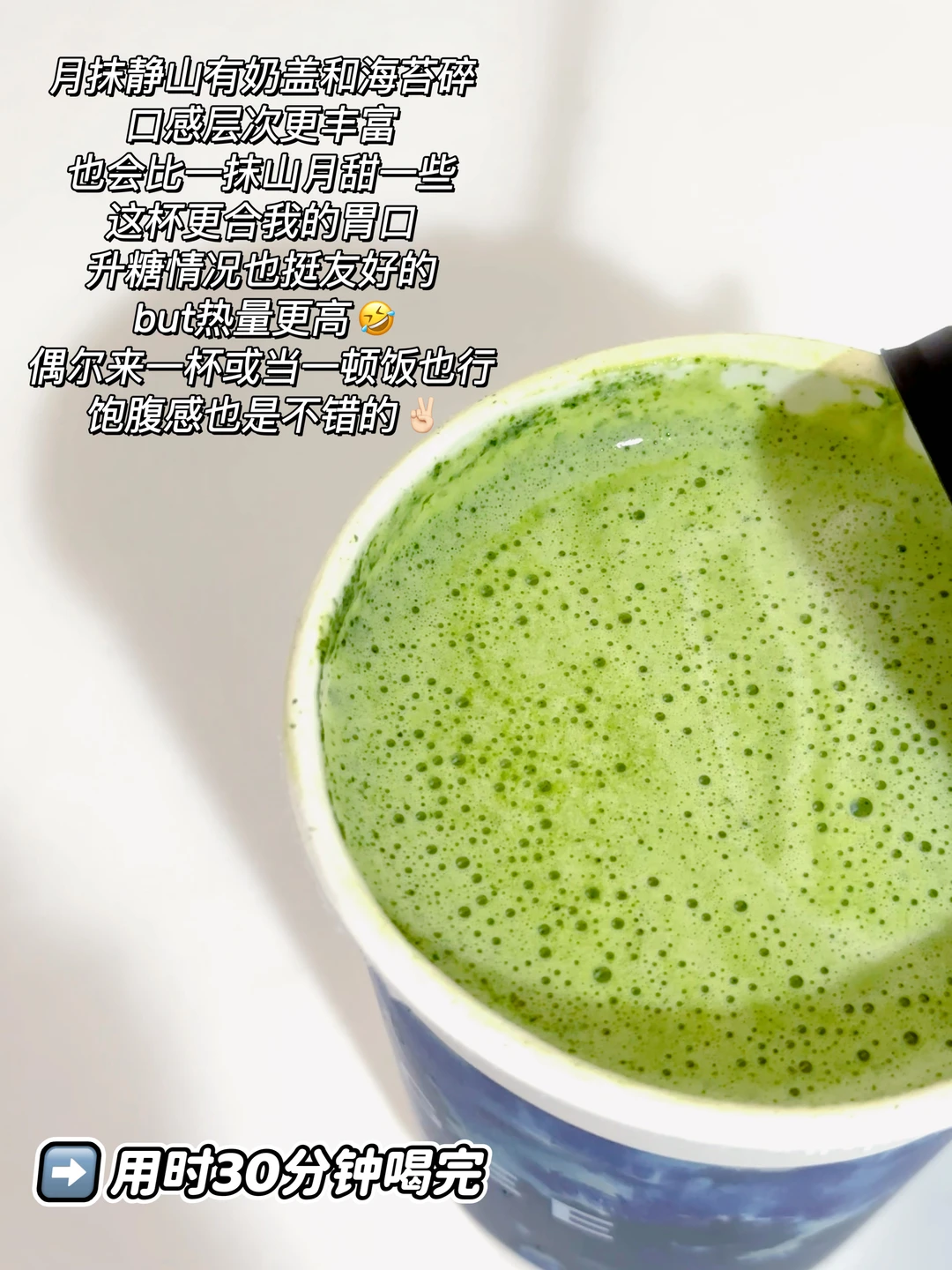 月抹静山有奶盖和海苔碎,口感层次更丰富,也会比一抹山月甜一些,这杯更合我的胃口[耶R]升糖情况也挺友好的,but热量更高🤣偶尔来一杯或当一顿饭也行,饱腹感也是不错的✌🏻