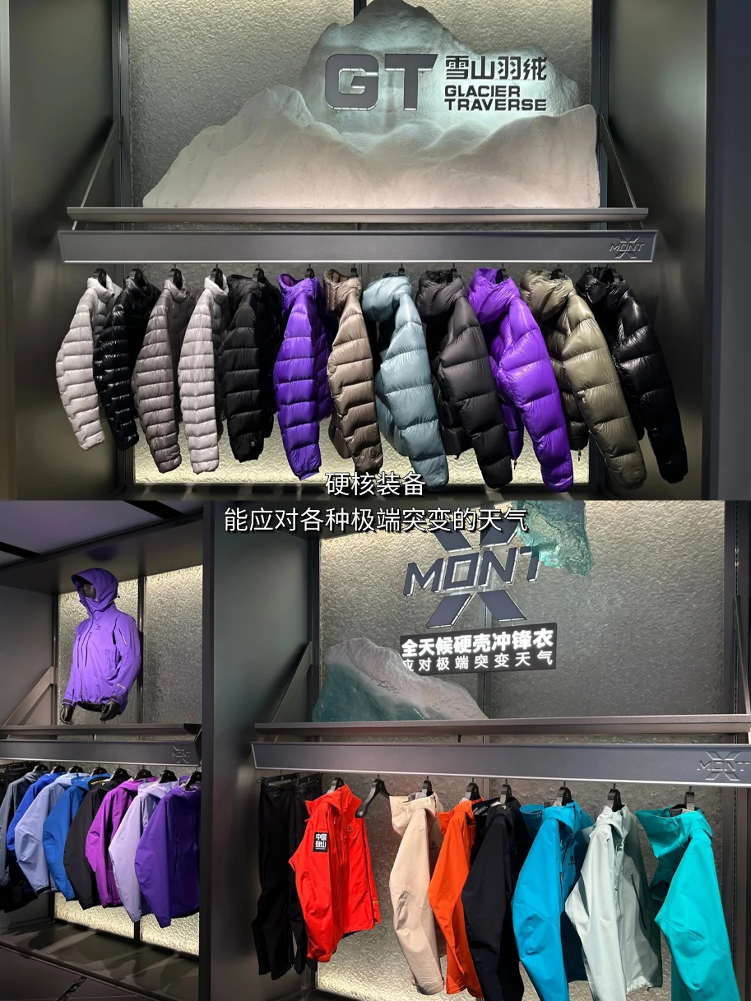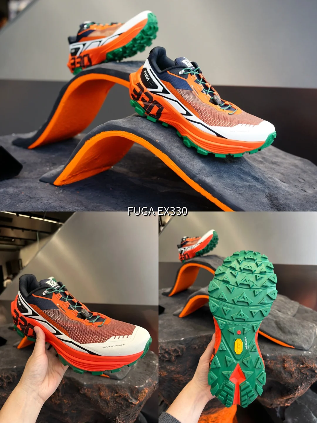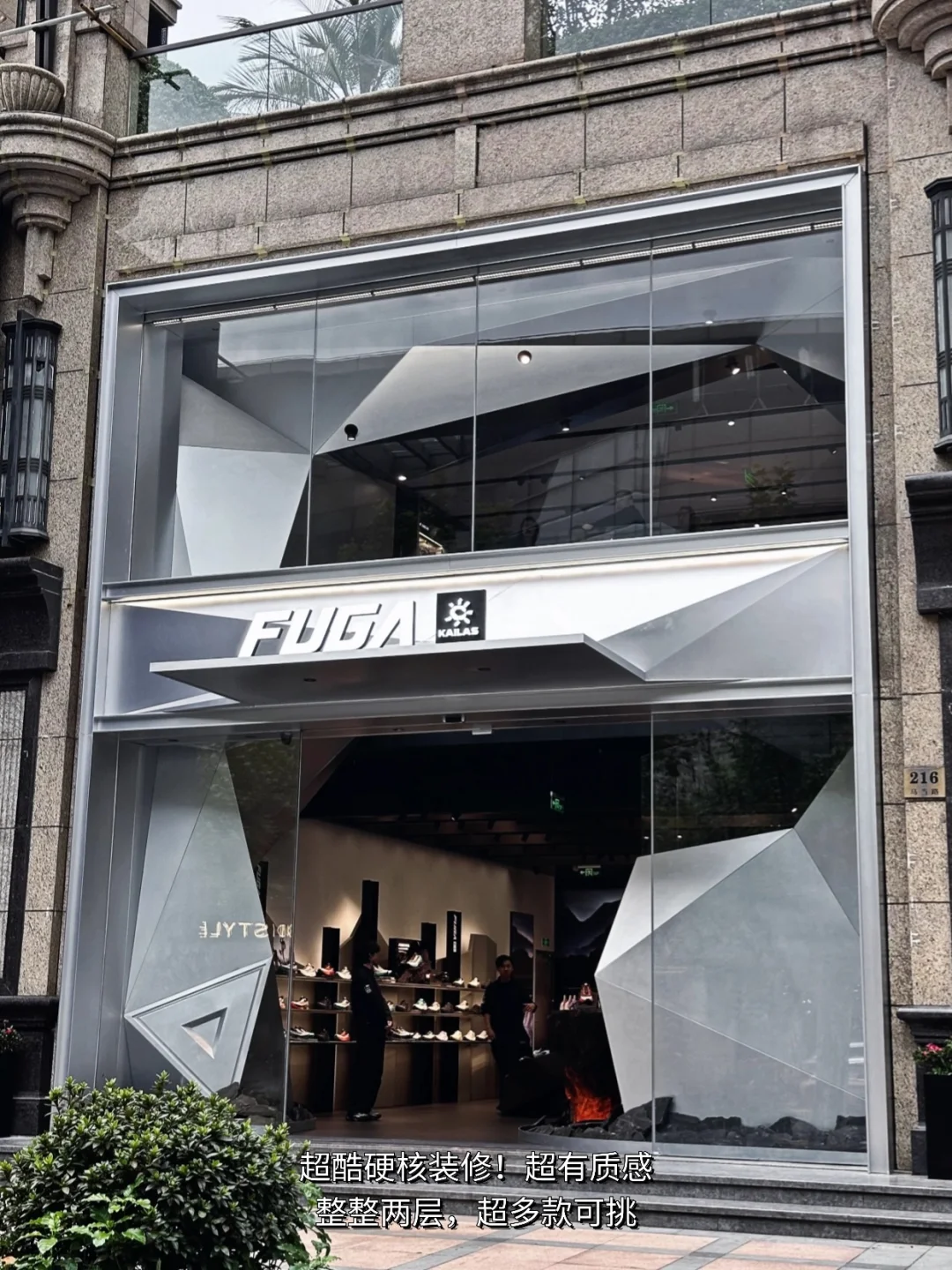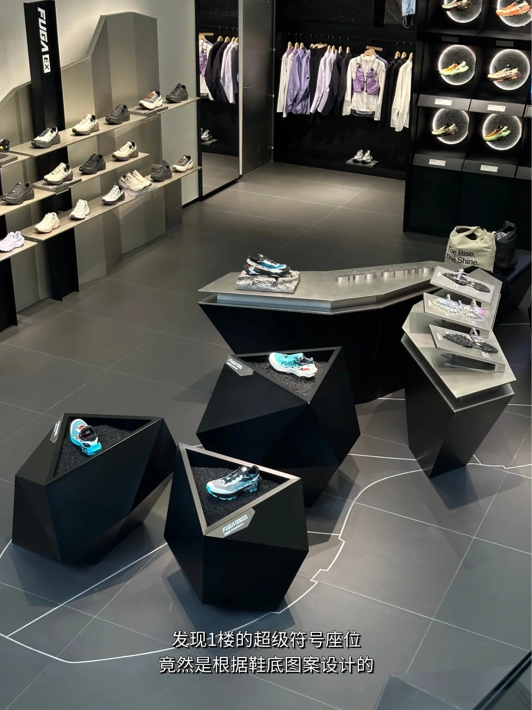 两层楼全落地窗,金属+山脉元素超有质感,1楼的超级符号区域,你发现灵感来源于FUGA的标志性鞋底吗?简直绝妙~ 空间设计融入了裸岩、山川等元素,模拟沉浸式山地体验。