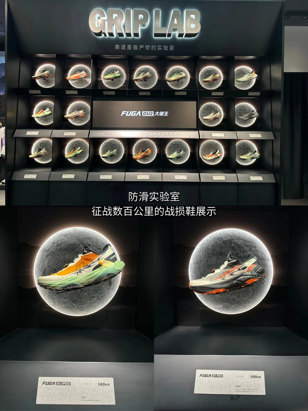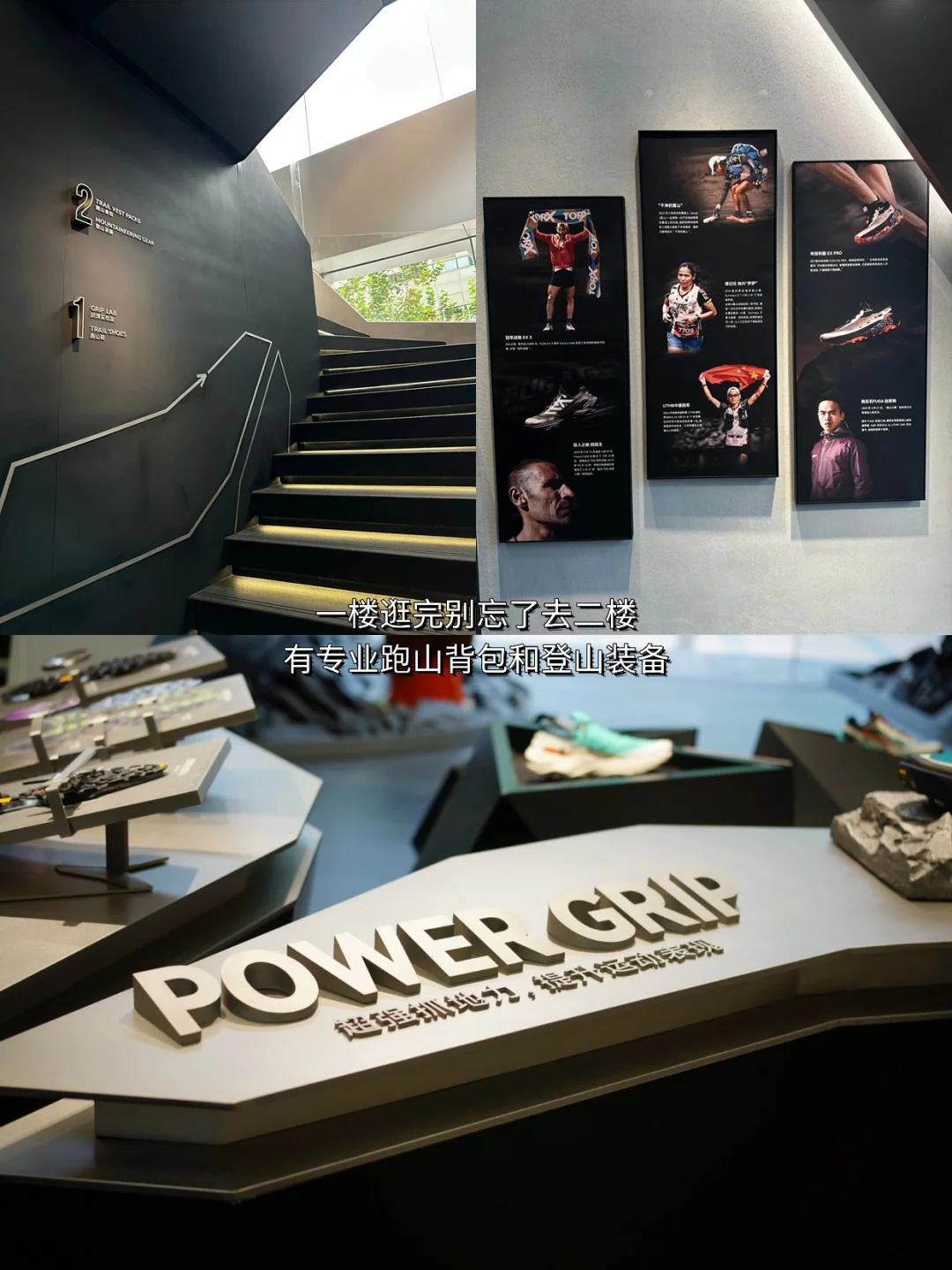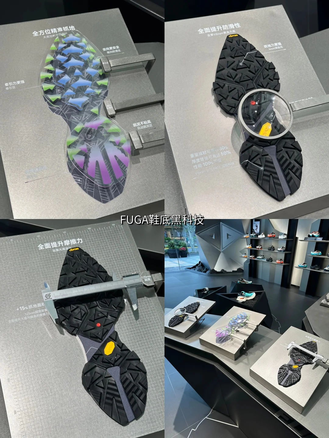 一进门就被震撼到,陈列着征战数百公里的"伤痕累累"的战损鞋,每双鞋都是跑者勋章,瞬间热血沸腾🏃。旁边还有镶嵌了真实Vibram大底的展示模块,直观展示核心防滑科技,将视觉震撼与专业科普完美融合。