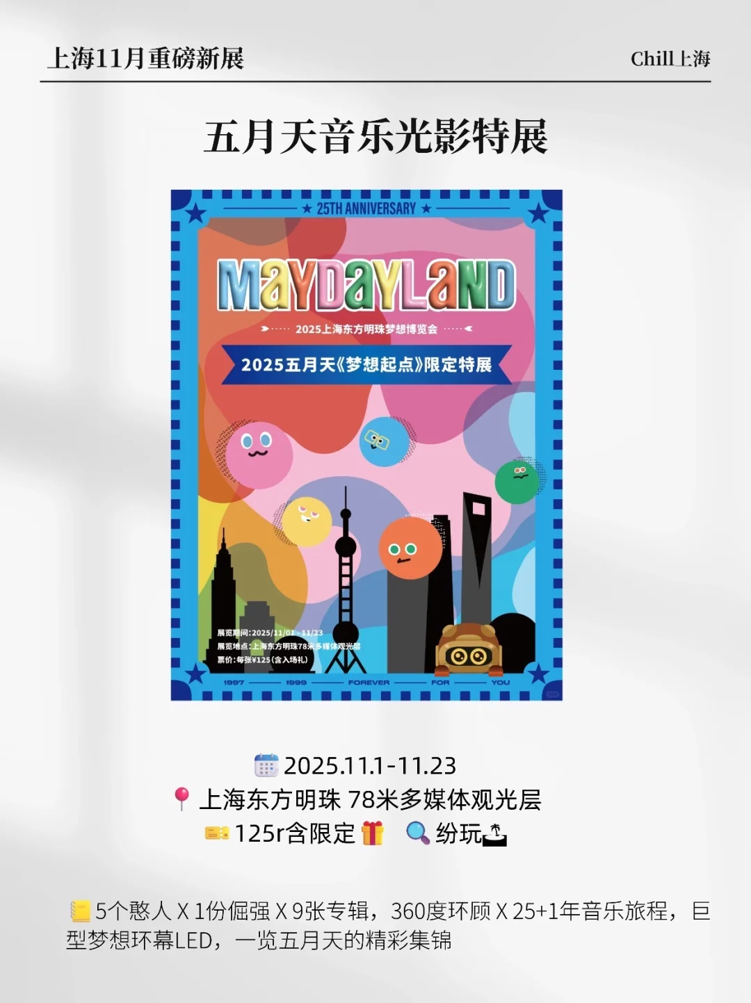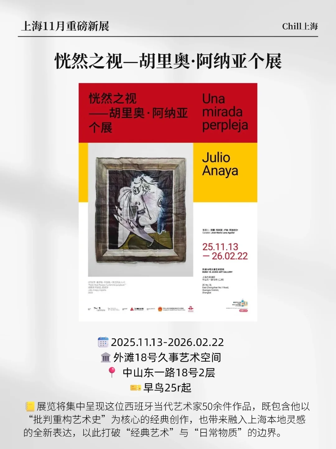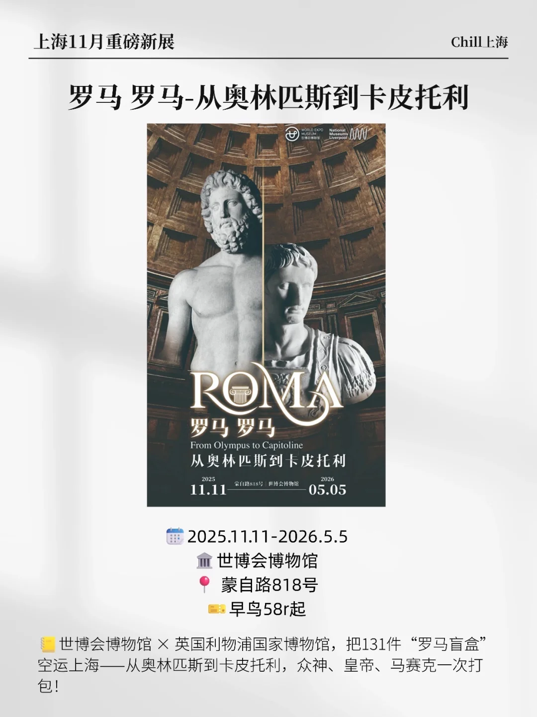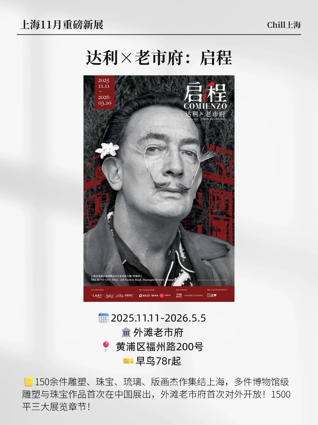 上海展览又上新啦! 11月集结了超多重磅的新展来了!攻略速码! 🖼罗马 罗马-从奥林匹斯到卡皮托利 🖼达利×老市府:启程 🖼五月天音乐光影特展 🖼浪奔·浪流-2025陈幼坚、欧阳应霁双个展 🖼2025上海双年展 🖼伟大的掩饰 🖼恍然之视—胡里奥·阿纳亚个展 🖼城市邂逅邬达克 🖼太空:内在的辉光 🖼重新发现时间-第二届中国当代影像艺术年鉴展