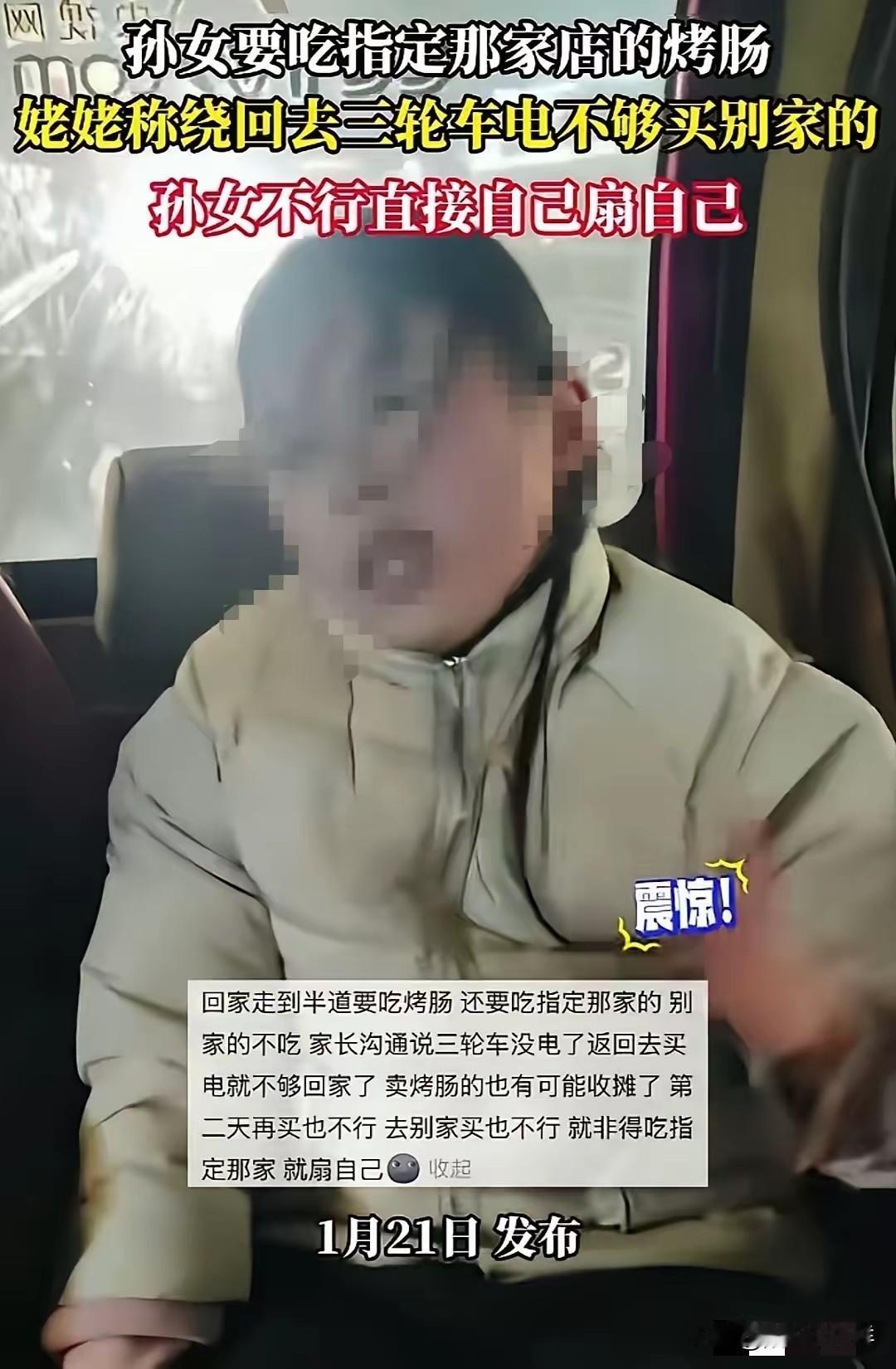 “决不手软”!一网友发布视频,姥姥接外孙女放学回家,孙女半道上想吃烤肠,还指定必须吃那家的。姥姥说再折返回去买烤肠,电瓶车电就不够回家的。劝说明天给买不行,换一家给买也不行。孙女见姥姥不给买,居然用手扇脸,一直不停扇脸,脸都扇红了,但就是咬着牙继续扇! 这段视频1月21号发上网,22号开始就火了,好多人都在看、在讨论。大家主要吵俩事儿:一是这孩子咋这么极端,二是这视频是不是故意拍的。 姥姥骑电瓶车接孩子,本来就怕没电回不了家,首要任务是把孩子安全送回去。可这孩子不管这些,就认准了那一家的烤肠,不给买就自己扇自己,看着都让人着急。 最近总听说小孩做极端事儿的新闻,有因为充电器跟妈妈吵架动手的,还有初中生欺负小学生的。说白了,就是这些孩子没规矩,受不了一点不顺心。 更让人起疑的是,现在好多自媒体就爱拍这种有冲突的视频博眼球。前阵子刚有人拍“50块买名酒”的假视频被处罚,网信办也一直在查这种虚构内容。 不少网友看了烤肠这视频,都觉得不对劲:镜头拍得太巧了,孩子扇自己的样子也太夸张,搞不好是大人教着拍的,就为了涨粉赚钱。而且最近网上好多类似“小孩撒泼”的视频,都是故意制造矛盾吸引关注。 不管视频是真的还是假的,家庭教育这事儿确实得重视。好多家里对孩子太娇惯,他想要啥就必须给,慢慢就养成了“只要我闹得够凶,就能得到想要的”的想法。之前还有地方发生过孙女在法庭上扇奶奶耳光的事,最后被法官批评教育了。 再说了,就算是小孩,也不能随便来极端的。家长不管好,以后到了社会上肯定要吃亏。而且网上发视频也不能瞎编,编故事骗人是要被查的。 这事儿到底是孩子被惯坏了,还是自媒体为了流量摆拍?真实发生的话该怎么教育孩子,要是假的又该怎么管这些乱拍视频的? 各位读者你们怎么看?欢迎在评论区讨论。