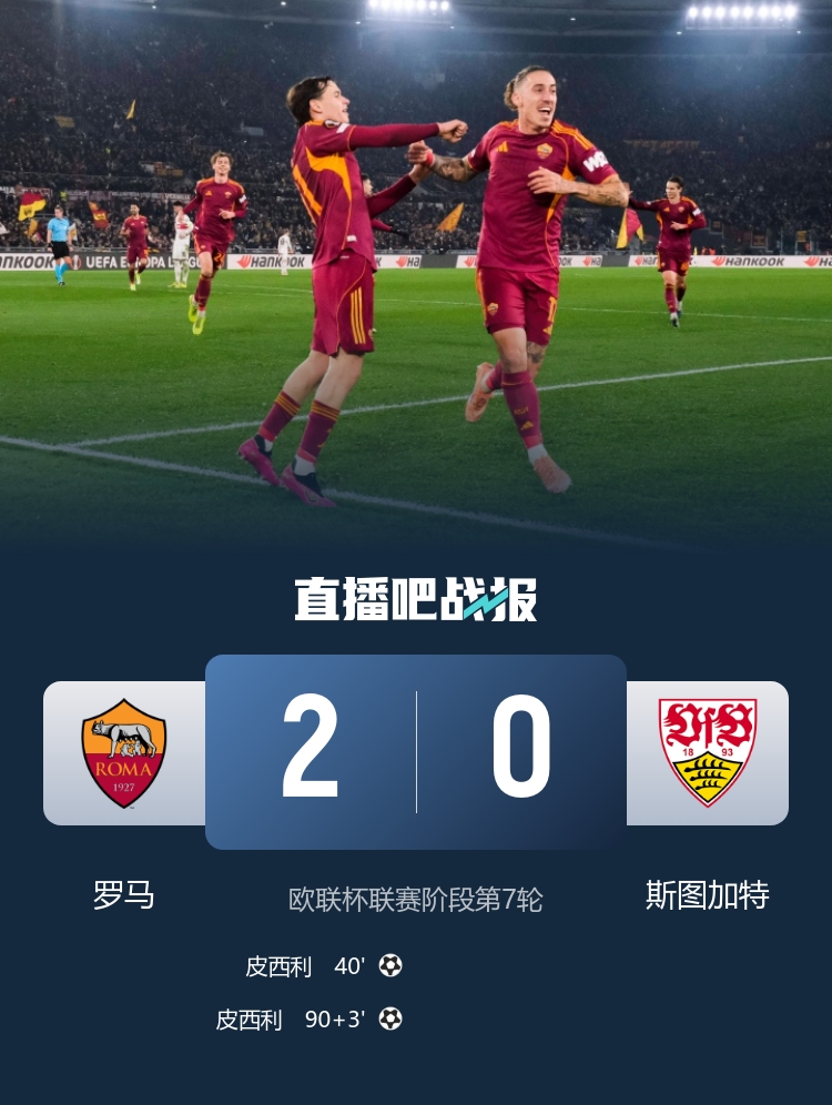 罗马2-0斯图加特。积分榜方面,罗马15分升至第6,斯图加特12分第12。