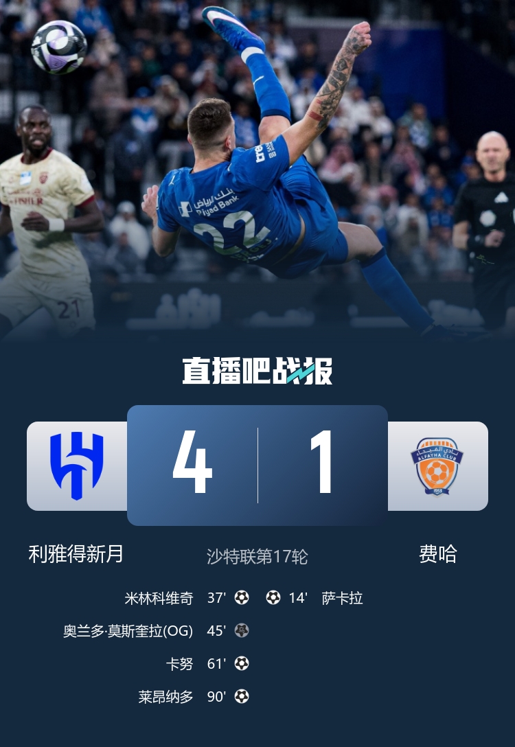 利雅得新月主场4-1逆转费哈,新月豪取联赛13连胜,积44分继续领跑+领先第2名胜利7分。