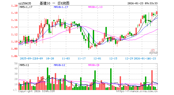 1月23日,基建ETF华夏(159635)开盘涨0.17%,报1.175元。基建ETF华夏(159635)重仓股方面,中国建筑开盘涨0.20%,中国中铁涨0.18%,中国电建涨0.34%,徐工机械涨0.64%,中联重科涨0.23%,三一重工涨0.44%,中国铁建涨0.13%,中国能建涨0.40%,中国交建涨0.12%,金诚信涨0.93%。