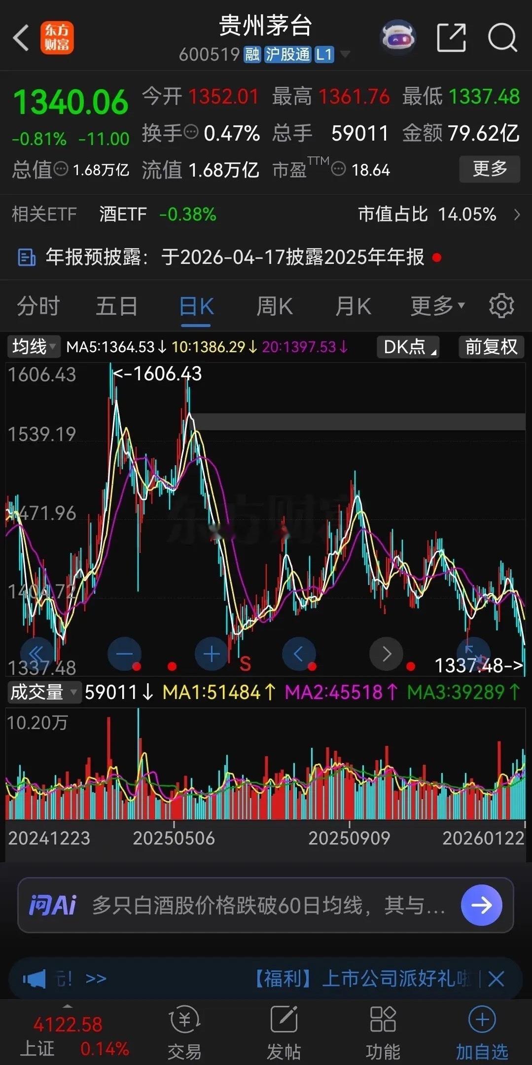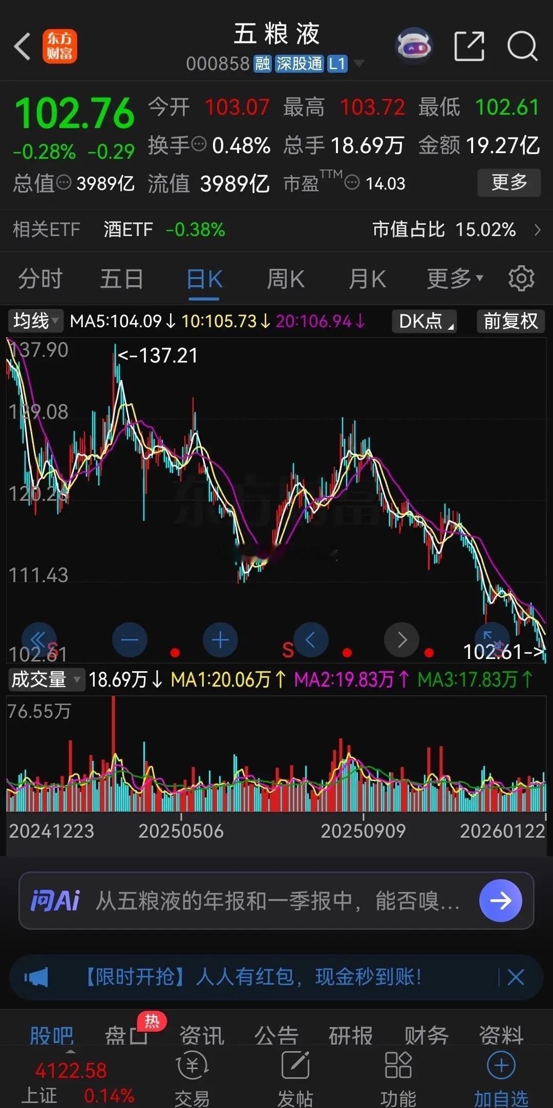 昨天三大股指全线上涨,而白酒龙头贵州茅台、五粮液、泸州老窖却继续逆势下跌,且全部都破位,呈现加速下跌态势。目前有口子窖、水井坊、金种子酒三家白酒公司披露了年报,其中金种子酒亏损,其他两家大幅下滑。可以预见其他白酒公司也好不到哪去,业绩集体暴雷的可能性也是非常大的。白酒板块之所以持续下跌,一是因为消费低迷,业绩持续下降,增长的逻辑不在了。二是因为白酒前些年被抱团疯狂爆炒,上涨了十几倍,甚至几十倍,充满了泡沫,现在是价值回归的过程。贵州茅台的合理股价500元左右,五粮液、泸州老窖50元左右,让老百姓都喝得起好酒不好吗?