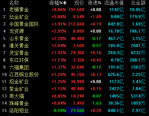 上证报中国证券网讯(李子健记者周亮)1月23日,港股黄金板块表现活跃,老铺黄金、坛金矿业、中国黄金国际涨幅居前,截至10时38分,上述股票分别上涨8.06%、5.88%及3.91%。