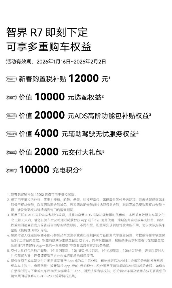 智界汽车新春购车权益加码 春节脚步渐近,智界汽车也上了波购车权益,1月16日到2月2日,选择智界全系车型,能享受至高12000元的新春购置税补贴,智界R7至高享49000元购车权益,智界新S7至高59000元权益,昨天智界R7还破了全球量产SUV风阻系数记录,续航无压力,买车减负担,新年开智界真的很舒坦!