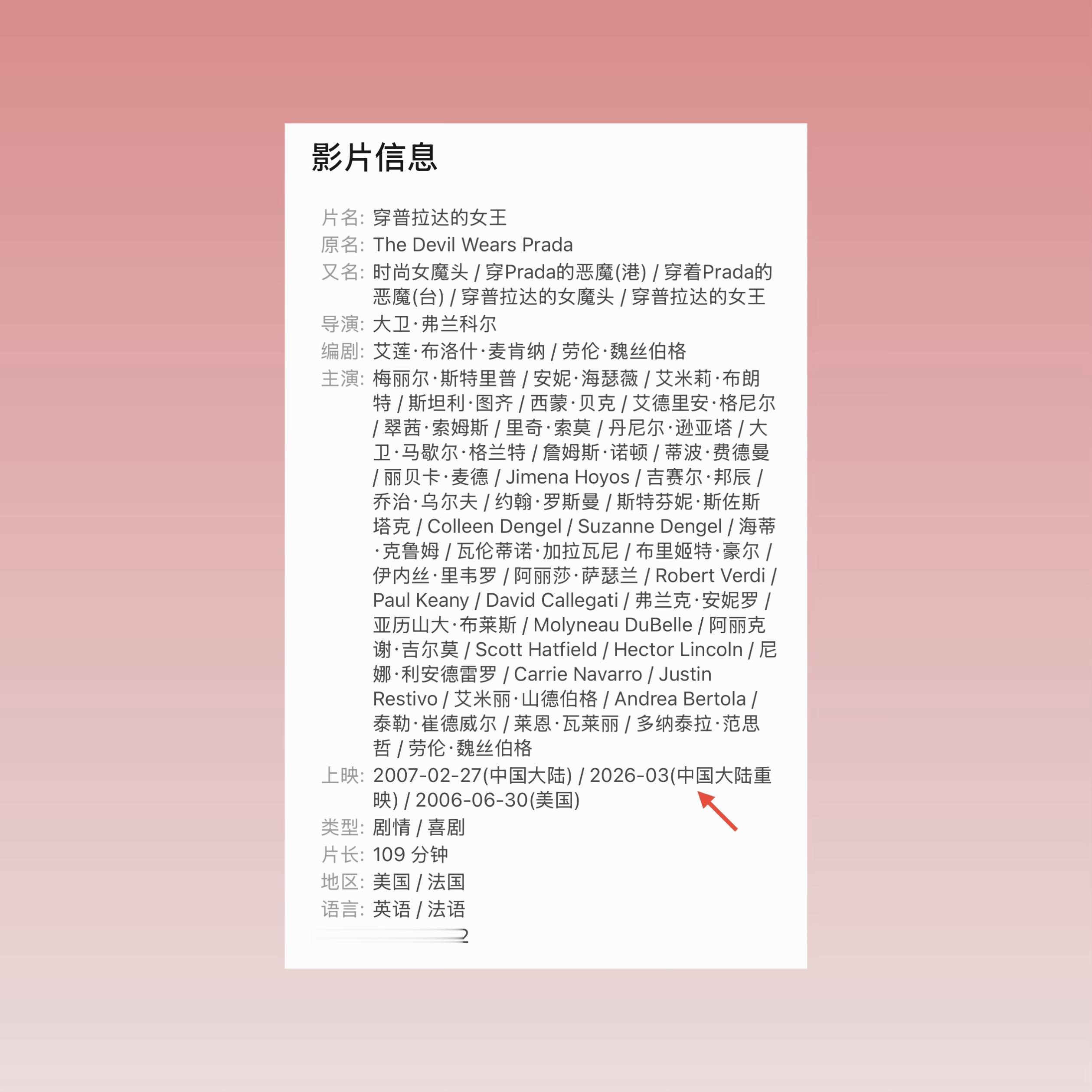 豆瓣显示,《穿普拉达的女王》有望今年3月内地重映,纪念该片上映二十周年,爱信等!