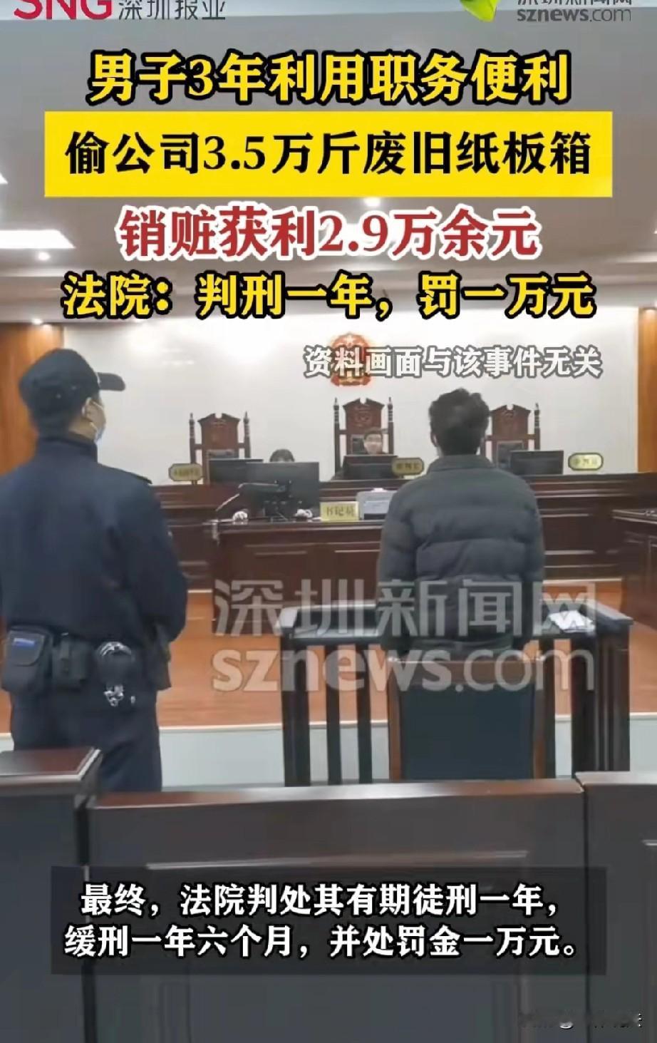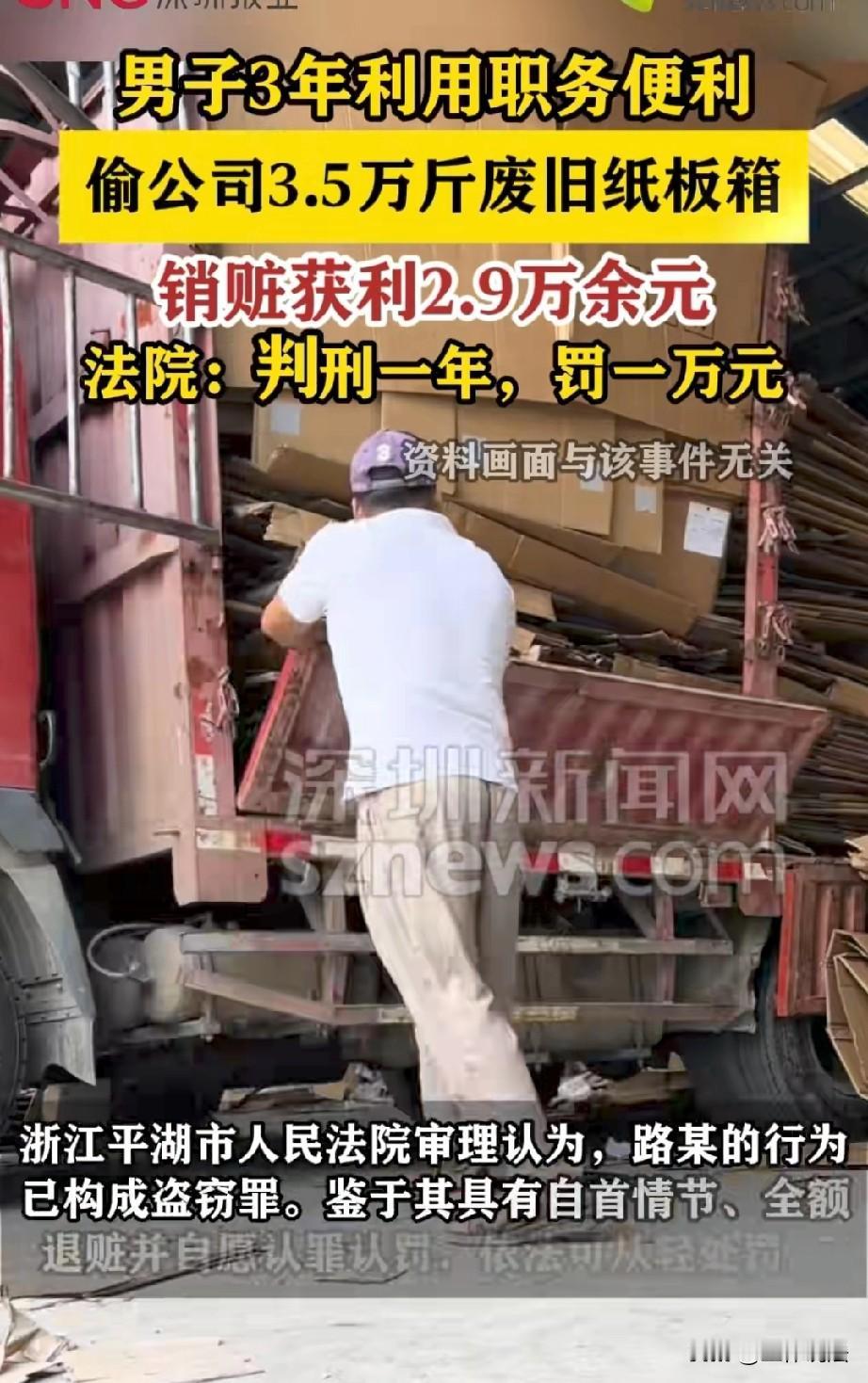 浙江平湖,40多岁的仓库管理员,见公司废旧纸板多,便想着一来帮公司清理垃圾,二来整个二十来块补贴家用,便将纸板收集起来,运出去卖掉。三年时间,运走3.5万斤纸板,卖了2.9万元。万万没想到,公司发现后马上报警,管理员害怕极了,主动承认错误,并赶紧退回了3.1万元。但是,法院还是以盗窃罪,将他判刑。 四十来岁的路某在一家公司当仓库管理员,这家公司生产车间每天都会集中处理不少废旧纸箱。 路某瞅着这些纸箱,心里就打起了小算盘。 从2022年4月开始,一直到2025年9月,这三年多的时间里,路某仗着自己仓库管理员的职务便利,隔三岔五就把那些废旧纸箱私自拿走,偷偷藏在仓库里。 他想着,反正这些纸箱平时也没人重视,一天也就值个二三十块钱,公司估计也不会当回事儿,别人发现不了。 藏好纸箱后,路某联系了李某,让李某驾车把这些纸箱偷运到外地变卖。 就这样,三年多的时间里,路某陆陆续续偷运了好多次,纸箱累计达到了3.5万斤,卖了2.9万余元。 就在他以为神不知鬼不觉时,去年年9月26日,路某的“好事”终于被发现,他被公安局刑事拘留。 路某一下子就慌了,但还是抱着侥幸心理,觉得只是拿点纸板,没什么大不了。 10月24日,路某转为取保候审。在案件侦查期间,路某得知有人报警,他知道,自己跑不掉,还不如老实点。 当地价格认证中心对这些涉案纸箱进行了价值认定,确认这些纸箱价值27469元。 他如实交代了自己的犯罪经过,并主动退回赃款3.1万余元。 明明评估了2.7万,也只卖了2.9万,为什么要退回去3万多呢,这是什么逻辑?原来,路某想着这样能从宽处理。 法院经过审理认为,路某以非法占有为目的,采用秘密手段多次窃取公司财物,价值2.7万余元,数额较大,该行为已经构成盗窃罪。 不过呢,考虑到路某具有自首情节,而且已经退清了全部赃款,认罪认罚的态度也挺好,依法可以从轻处罚。 最后,法院依据相关法律规定,判处路某有期徒刑一年,缓刑一年六个月,并处罚金一万元。 对路某的判决是不是太重了些呢?纸板是大件东西,不是随便揣到兜里就能带走的,整整三年时间,公司难道真的毫无察觉吗? 很可能,公司觉得库管每天捡点纸壳什么的问题不大,也算给厂里清理垃圾,开始并没有当回事。 可后面见他攒多了,挣钱了,有人眼红了就举报人家,公司就跑来找你麻烦,小题大做,这格局简直太小了,干不大也干不长久。 这事儿让人心里挺不是滋味的,四十来岁的仓库管理员,估计工资也不算高,想着那些没人当回事的废纸箱,一天卖二三十块,一来补贴家用,二来帮公司清理垃圾,一举两得。 没成想攒了三年,最后把自己栽进去了。 底层人过日子是真不容易,上有老下有小,柴米油盐处处要花钱,总想能多挣一点是一点。 但再难也不能动歪心思,人穷志不短,那些纸箱看着是废料,可终究是公司的东西,不能伸手。 手一旦伸出去,就收不回来了,一次两次没被发现,就会越来越大胆,最后越陷越深。 管好自己的手,守住自己的志,再难的日子也能慢慢熬过去,动歪心思的捷径,从来都是坑。