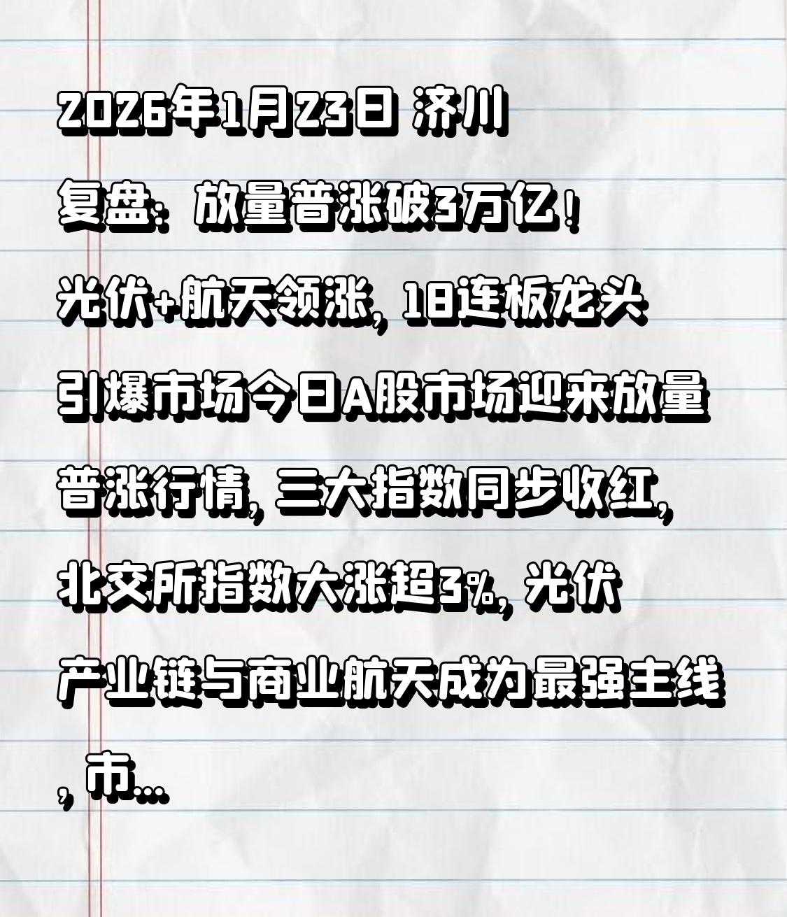 2026年1月23日 济川复盘: 放量普涨破3万亿!光伏+航天领涨,18连板龙头引爆市场 今日A股市场迎来放量普涨行情,三大指数同步收红,北交所指数大涨超3%,光伏产业链与商业航天成为最强主线,市场赚钱效应显著。以下为全天核心行情复盘: 一、大盘核心表现 上证指数:4136.16点(+13.58点,+0.33%) 深证成指:14439.66点(+112.61点,+0.79%) 北证50:1588.66点(+58.42点,+3.82%) 成交与情绪:两市成交总额达30852亿元,较前一日放量3935亿元(+14.62%);上涨股票3941只,涨停120只;下跌股票1390只,跌停2只,涨跌比接近3:1,市场情绪极度活跃。 二、强势板块与核心题材 (一)行业板块涨幅TOP5 光伏设备:+9.14%(主力净流入88.42亿元,22家涨停,全产业链爆发) 能源金属:+5.21%(主力净流入29.63亿元) 电池:+3.93%(主力净流入18.49亿元) 有色金属:+3.74%(主力净流入21.76亿元) 贵金属:+3.51% (二)概念板块突出表现 商业航天:+4.21%(主力净流入145.22亿元,19家涨停,持续强势) HIT电池:+8.41%(主力净流入66.73亿元) BC电池:+7.48% TOPCon电池:+7.35% 钙钛矿电池:+7.03%(光伏电池技术路线集体走强) 三、个股龙头与涨停格局 (一)涨幅榜前列(20%左右涨停) 美畅股份(300861):+20.02% 瑞华泰(688323):+20.01% 拉普拉斯(688726):+20.01% 乾照光电(300102):+20.01% 广生堂(300436):+20.00% (二)连板龙头股 锋龙股份(机器人概念):18天18板(当前市场最高连板,引爆高风险偏好资金) 志特新材(新型城镇化):12天7板 三变科技(储能):10天5板 江化微:5连板 白银有色:4连板 四、资金流向重点 (一)主力净流入前五板块(亿元) 光伏设备:+88.42 能源金属:+29.63 光学光电子:+27.43 航天航空:+24.75 软件开发:+22.79 (二)概念板块资金流入TOP3(亿元) 商业航天:+145.22 太阳能:+109.14 卫星互联网:+100.94 五、重要资讯与机构观点 (一)政策与行业动态 央行表态:潘功胜行长强调将持续维护金融市场平稳运行,全力支持资本市场稳定发展; 光伏产业变革:中信建投指出,银价高企倒逼光伏金属化革命,铜替代银趋势明确,推动产业链技术迭代; 太空光伏:马斯克公开力挺,SpaceX与特斯拉目标未来三年实现每年100GW太阳能制造能力,提振板块信心; 商业航天:SpaceX计划2027年推出第二代“星链”系统,行业成长空间进一步打开。 (二)机构观点摘要 华泰证券:龙头房企压力缓释,有助于稳定市场预期,带动产业链修复; 中信证券:白酒行业处于底部配置区间,中长期性价比凸显。 六、市场特征与综合点评 (一)核心市场特征 放量突破:成交额突破3.1万亿元,创近期新高,资金进场意愿强烈; 主线明确:光伏产业链成为绝对主线,设备、电池、材料等细分领域全面涨停潮; 题材共振:商业航天、电池技术、机器人等多热点并行,赚钱效应扩散; 连板活跃:18连板龙头带动市场情绪,高风险偏好资金交易活跃。 (二)综合点评 今日A股呈现“放量普涨、主线清晰”的强势格局,光伏产业链受技术变革与巨头表态双重驱动,成为全场焦点; 商业航天概念延续强势,资金持续加仓,两大主线共同撑起市场热度。 市场成交量显著放大,涨停家数过百,涨跌比失衡式倾斜,显示投资者情绪已进入积极区间,机构对传统板块的预期改善进一步巩固市场信心。 (三)风险提示 光伏板块短期涨幅较大,后续可能出现分化行情,需警惕追高风险; 市场放量后需持续观察资金持续性与主线接力情况。