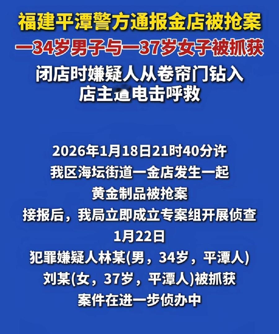 平潭抢劫金店夫妻俩,遇到什么困难?需要花大钱了吗?这什么年代了?到处监控,两口子组团抢金店!如果男子一个人,大龄单身社会青年,多少还能理解,二人80后,年轻人脑子也够用,34岁、37岁,上有老不说,也有孩子的人了,快过年了,就这么双双进去了!家也不打算要了!抢了价值200万金首饰,老婆比丈夫还大3岁,只有一个解释,两个大龄穷困潦倒青年,半路结婚,不务正业想一夜暴富!这下好了,过年进去吃牢饭了!抢劫罪,没十年八年出不来!